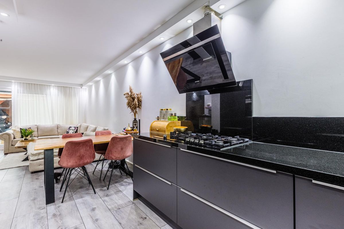De open keuken bevindt zich aan de voorzijde van het huis. Deze keuken is in 2018 vernieuwd en bestaat uit een keukenblok en een kastenwand. Het geheel heeft een strak, zwart design. Moderne apparatuur is er in de vorm van een vaatwasser, oven, magnetron, gasfornuis, afzuigkap, koelkast en vriezer.