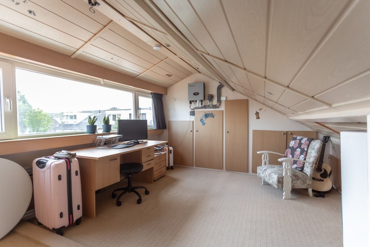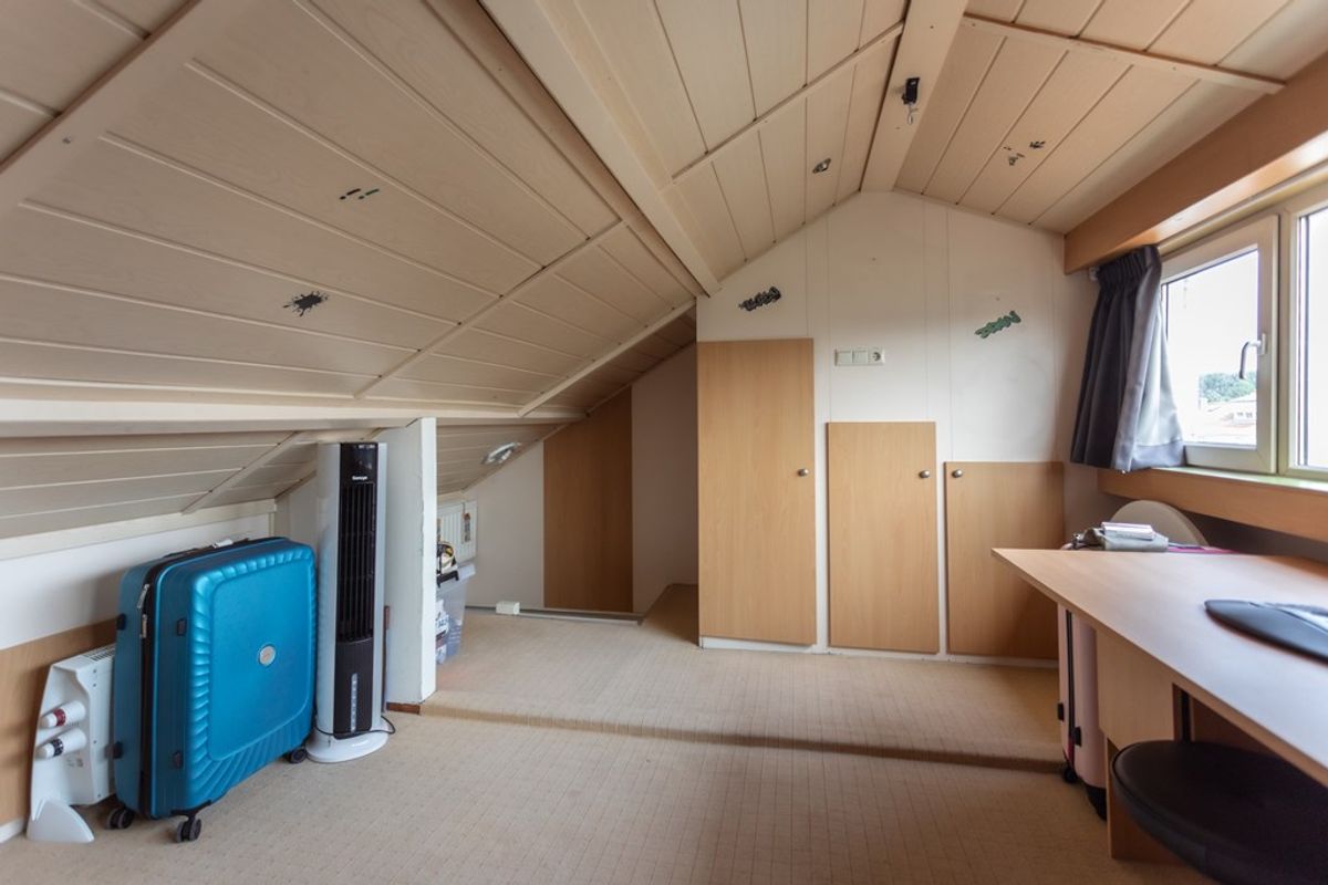 De vaste trap brengt je naar de zolder, waar een derde slaapkamer is gerealiseerd. De twee vaste kasten bieden volop bergruimte.