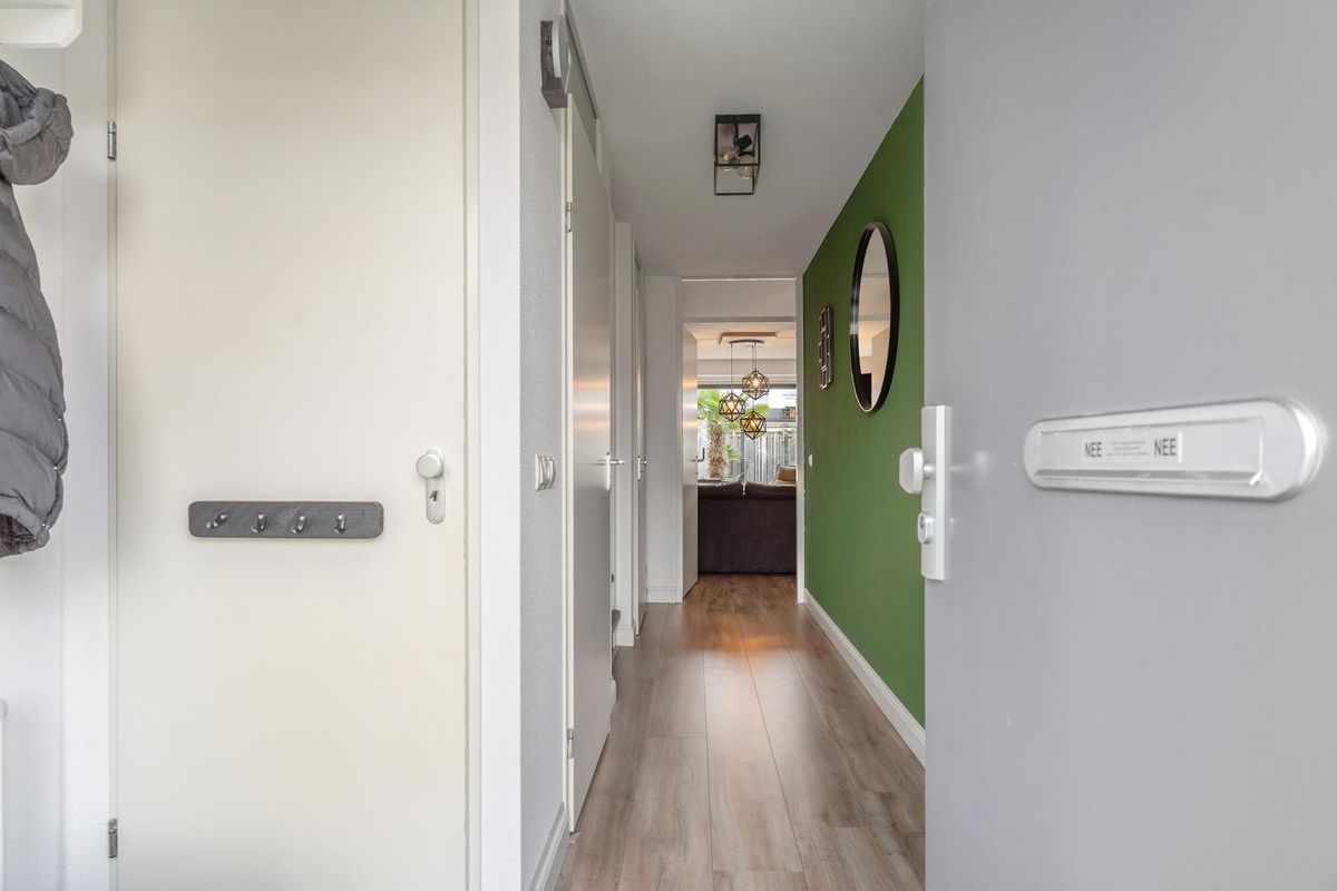 Via de verzorgde voortuin bereik je de entree van de woning. De hal biedt toegang tot de meterkast, het toilet, de trapopgang naar de eerste verdieping en de trapkast.