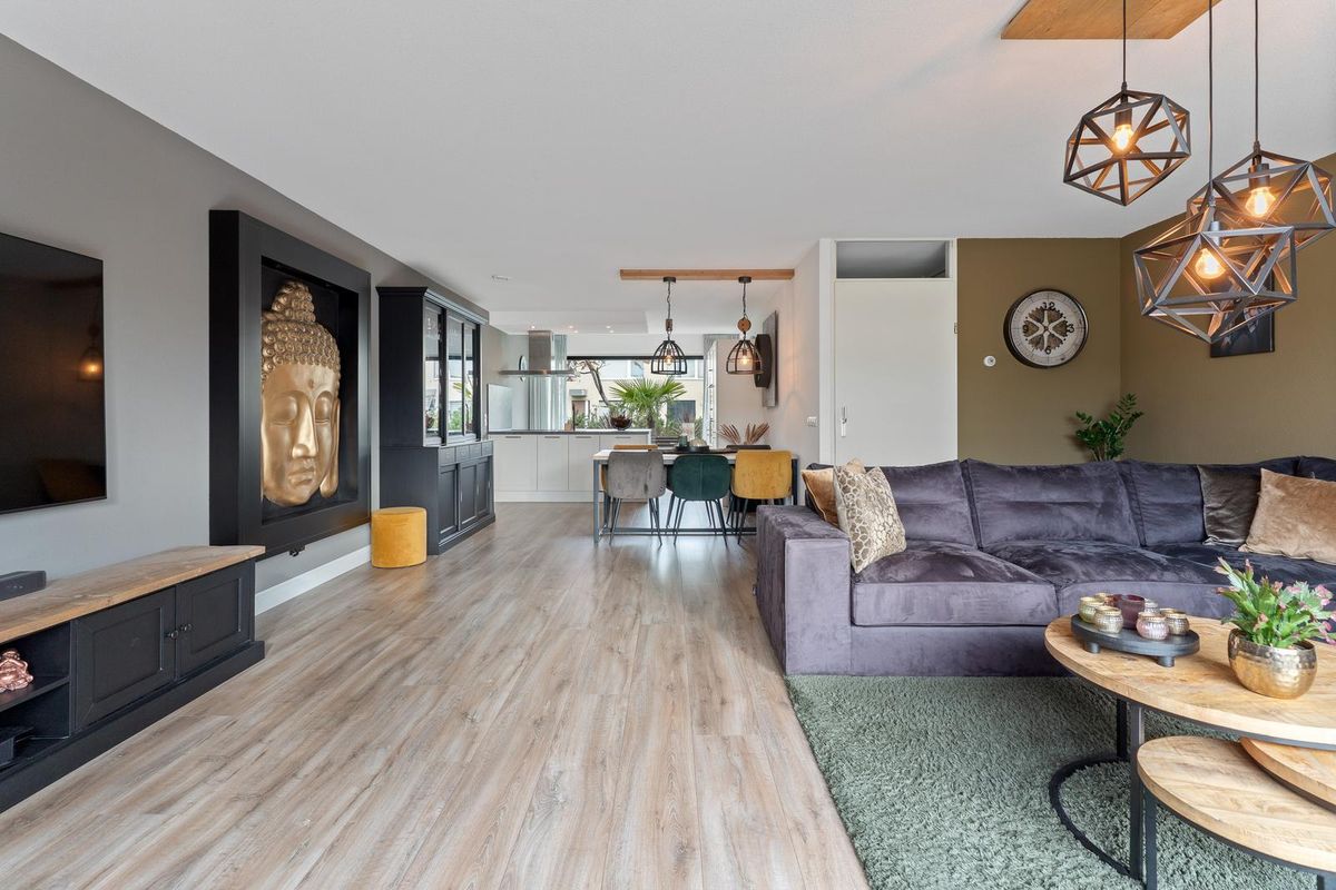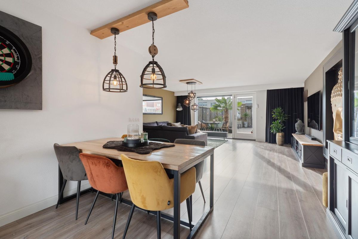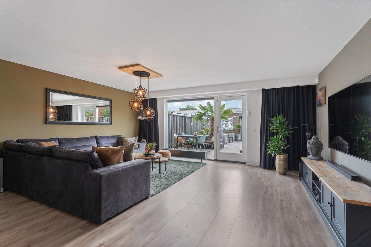 De zeer nette, brede woonkamer beschikt over een groot raampartij met veel lichtinval en directe toegang tot de achtertuin. De laminaatvloer zorgt voor een warme en moderne uitstraling.