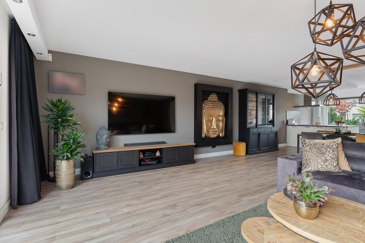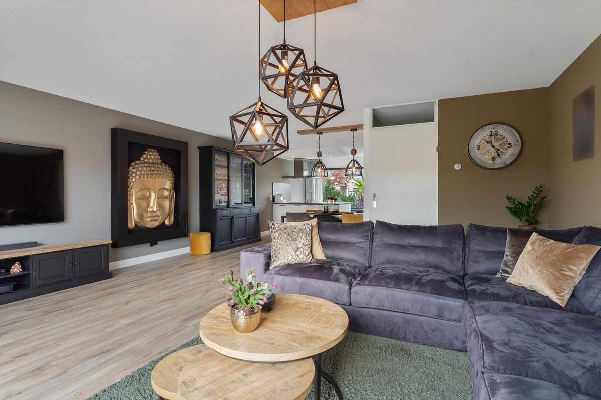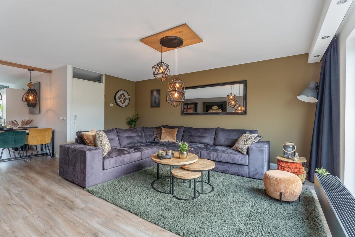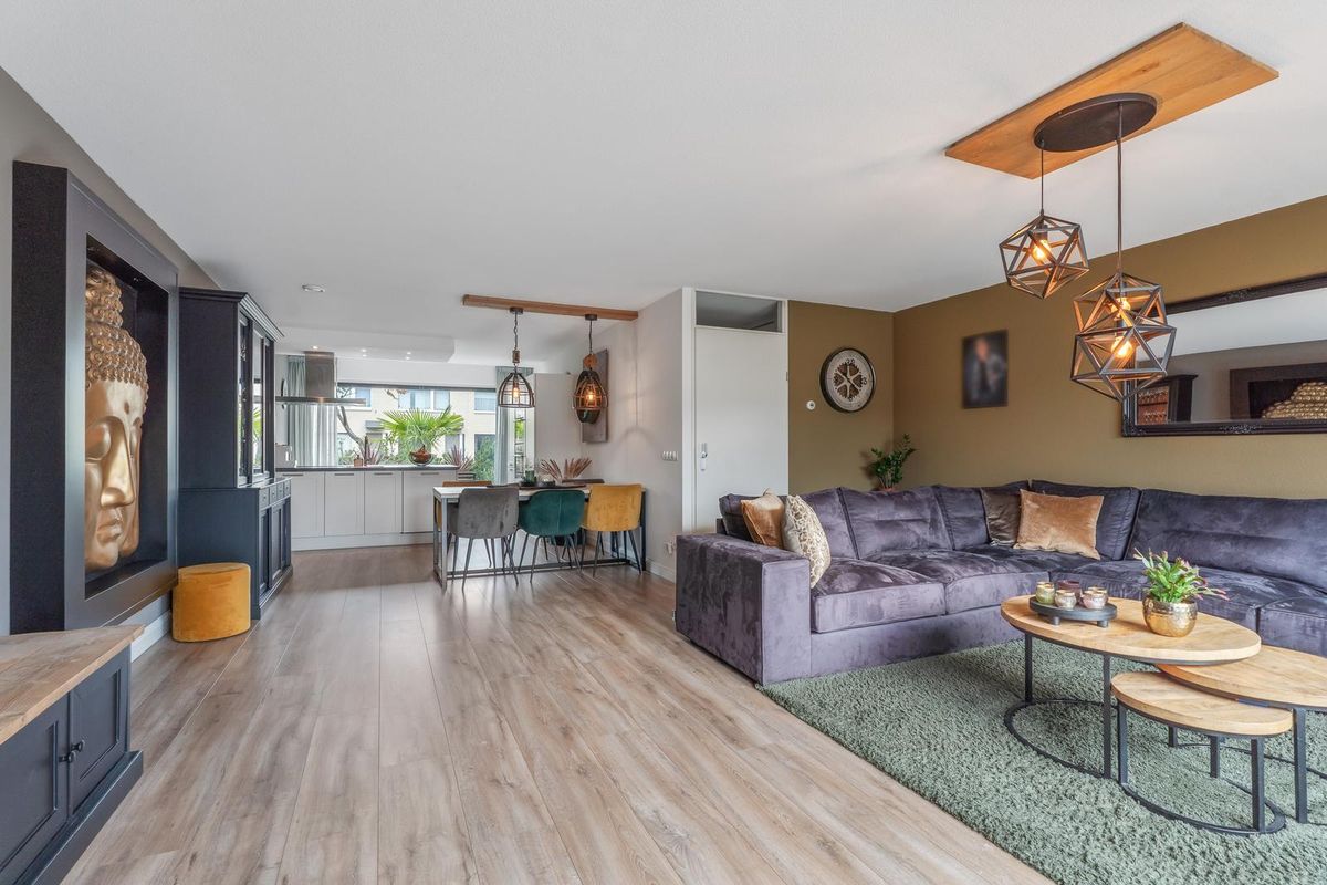 De zeer nette, brede woonkamer beschikt over een groot raampartij met veel lichtinval en directe toegang tot de achtertuin. De laminaatvloer zorgt voor een warme en moderne uitstraling.