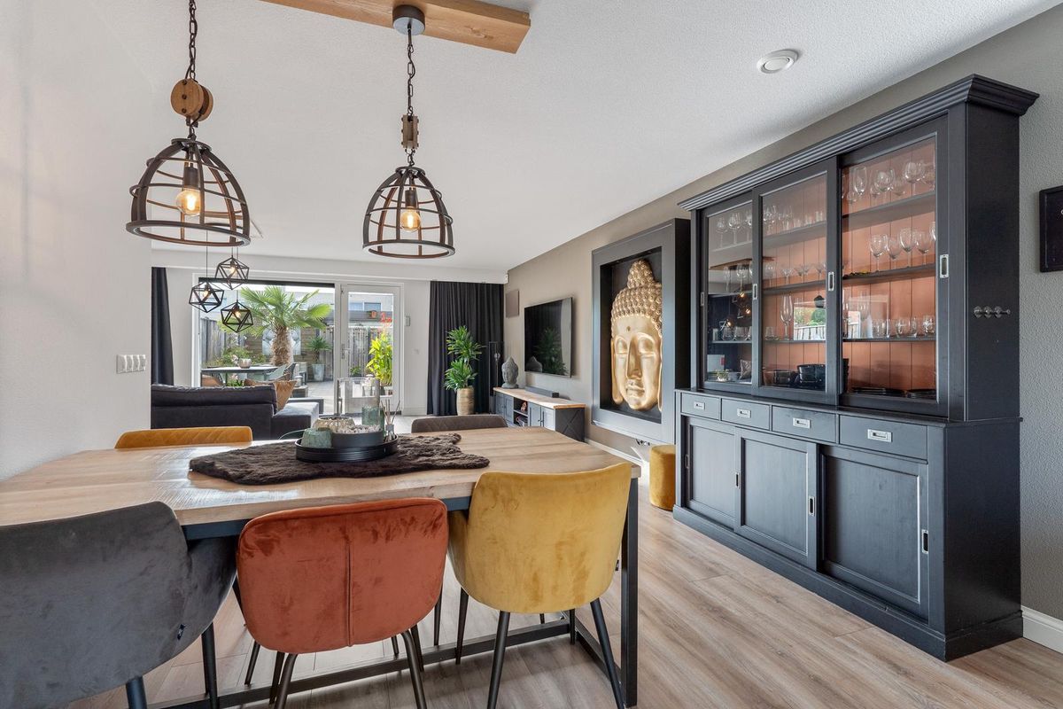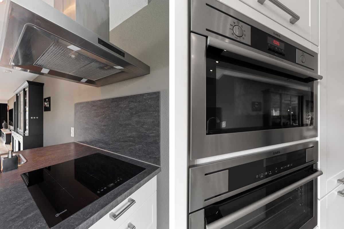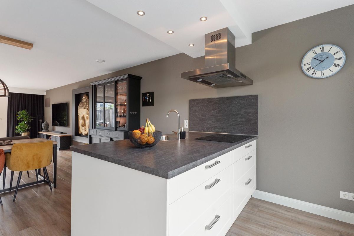 Aan de voorzijde bevindt zich het eetgedeelte, waar een grote eettafel perfect past. De keuken in eilandopstelling is voorzien van een vaatwasser, afzuigkap, inductiekookplaat, koel-vriescombinatie, combi-magnetron en combi-oven.