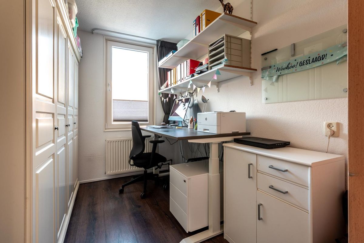 De zolderverdieping is verrassend ruim en ingericht als riante vierde slaapkamer met veel lichtinval dankzij de kunststof raamkozijnen. Ook hier vind je een airco die kan koelen en verwarmen. Daarnaast is er volop bergruimte, slim weggewerkt achter knieschotten en in een keurige ingebouwde kast bevind zich de wasmachine en droger opstelling.