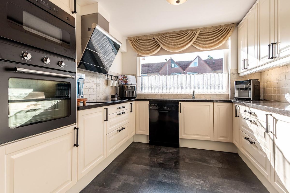 De keuken is aan de voorzijde gelegen en deze is voorzien van moderne inbouwapparatuur zoals een oven, magnetron (2020), vaatwasser (2023), inductiekookplaat en een afzuigkap (2023). Daarnaast bezit de keuken over voldoende opberg- en kastruimte.