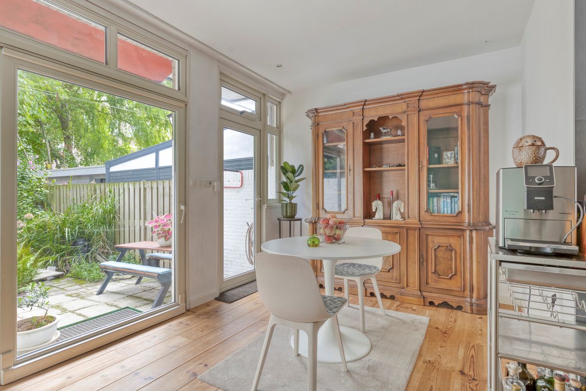 Private entrance with hallway providing access to all rooms. The industrial-style kitchen, with recently replaced appliances, is centrally located and creates a spacious living room at the front and a dining area at the back with a garden view. If desired, an additional bedroom can be created. This floor also features a solid wooden floor.