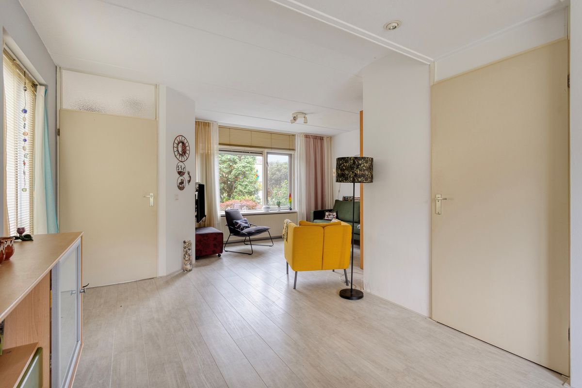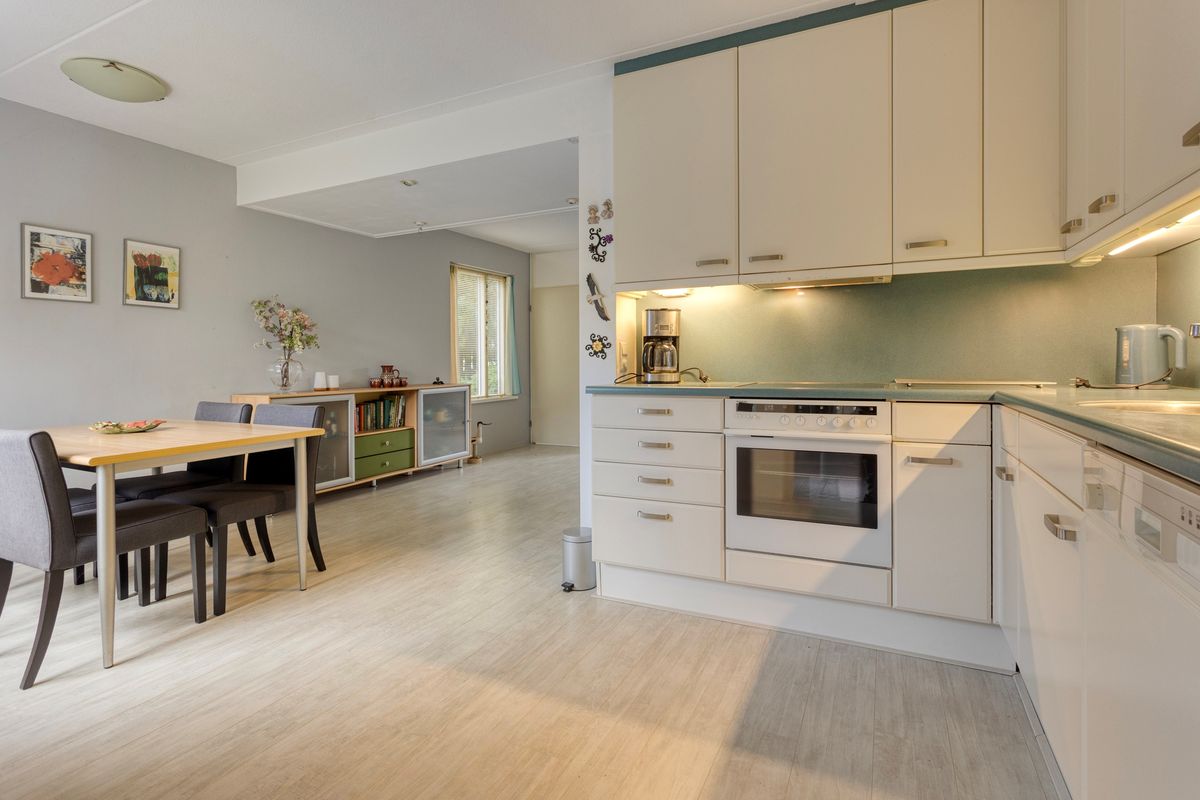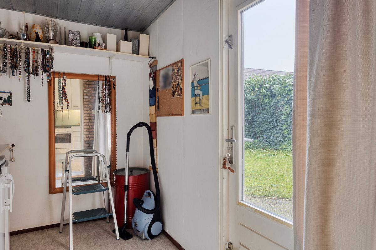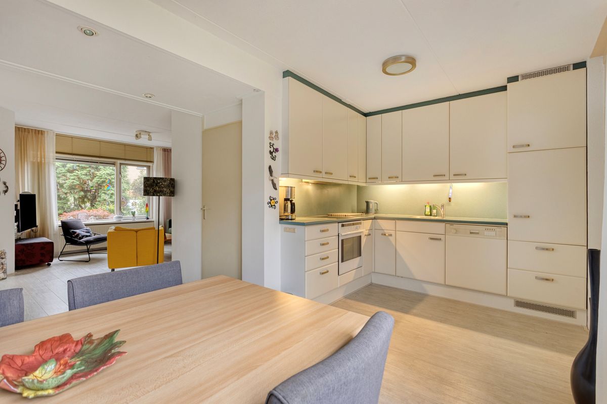 Entree met hal, meterkast en toilet. De lichte woonkamer heeft grote ramen en een prettige sfeer. De L-vormige keuken is praktisch ingericht en staat in verbinding met de bijkeuken, waar plek is voor de wasmachine en droger. Via de keuken loop je zo de ruime achtertuin in, ideaal voor lange zomeravonden of spelende kinderen. Naast de bijkeuken bevindt zich de schuur.