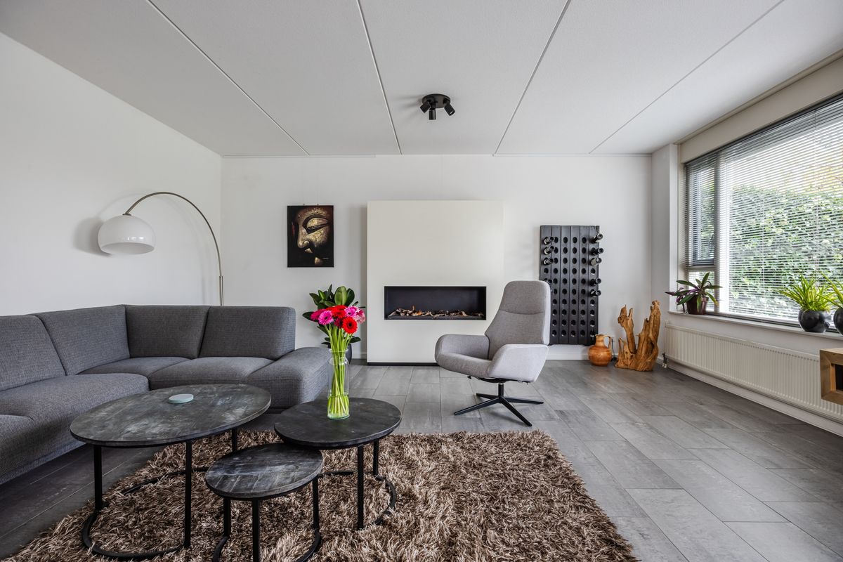 Bij binnenkomst in de hal is er aan de linkerzijde direct toegang tot de kantoorruimte (ca. 10 m2). In de hal bevindt zich ook de meterkast en het toilet alsmede de trapopgang naar de eerste verdieping. De toiletruimte is geheel betegeld en voorzien van een hangend closet en een fonteintje. De woonkamer op de begane grond is ingedeeld in een zit- en eetgedeelte waarbij de vele ramen voor een aangename natuurlijke lichtinval zorgen. In de zitkamer (ca. 37 m2) zorgt een bio ethanol haard voor extra sfeer en warmte. De zitkamer is van de eetkamer (ca. 27 m2) gescheiden door stijlvolle zwarte stalen deuren met helder glas, wat zorgt voor een luxe uitstraling. De moderne (hoogglans) open keuken is voorzien van een 4-pits keramische kookplaat, combi-oven, vaatwasser, koel/vriescombinatie, afzuigkap en veel kast- en werkruimte. Openslaande deuren geven toegang tot de achtertuin (ca. 133 m2), die gelegen is op het zuiden. De verzorgde ruime tuin geeft veel privacy. De achtertuin is ook te bereiken via een toegangspoort.