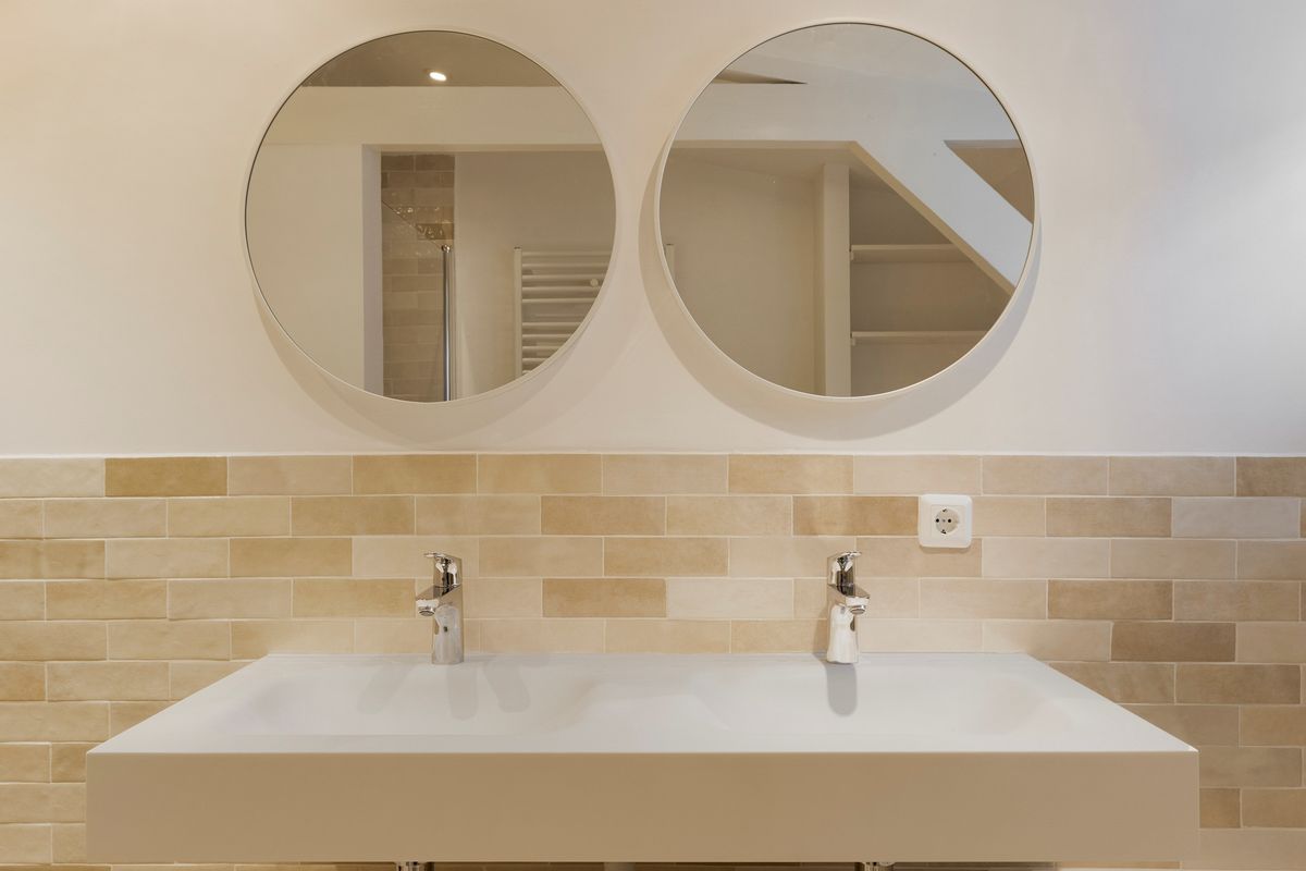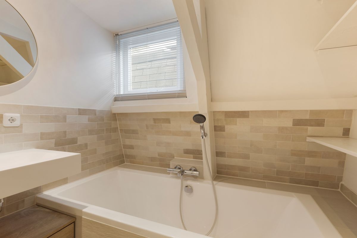 The bathroom is modern, renovated and has a nice bathtub, a separate shower and a sink.