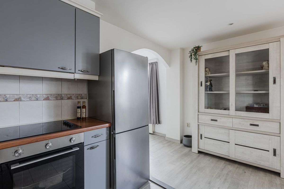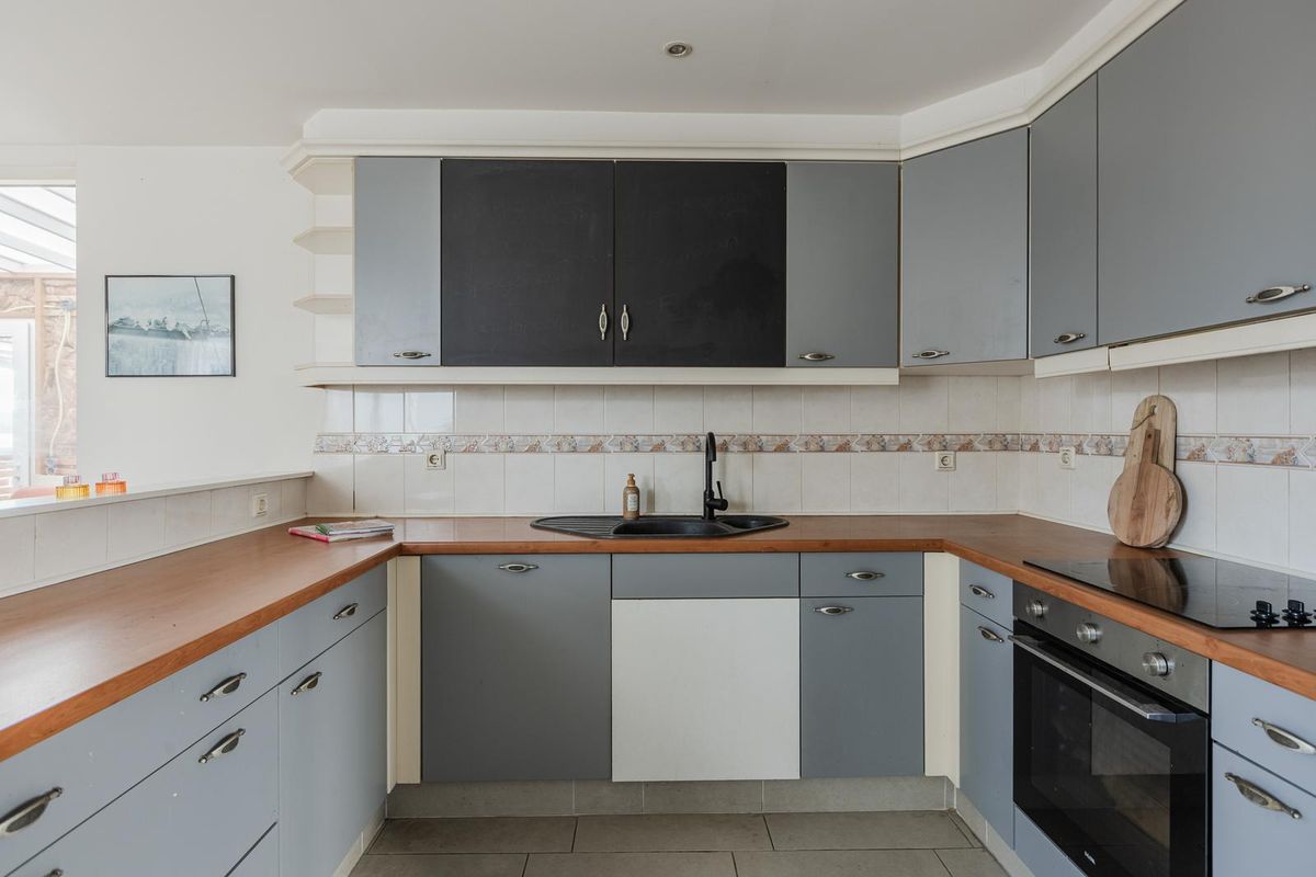 De keuken met tegelvloer en gestucte wanden en plafond is in een U-vorm opgesteld en biedt veel werkruimte. De keuken is uitgerust met (inbouw) apparatuur: Inductie kookplaat, afzuigkap, oven en een losstaande koelkast.