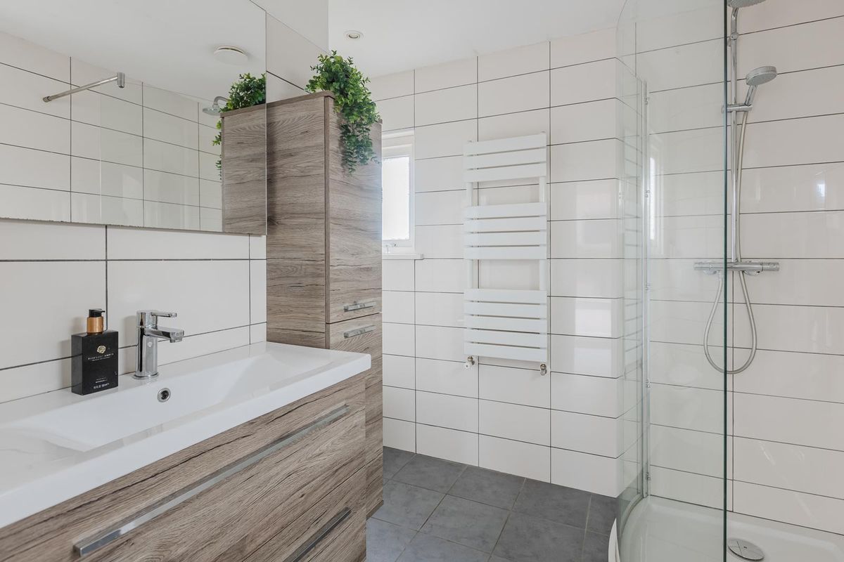 De badkamer is modern en voorzien van een tegelvloer, douche, toilet, handdoekradiator en een wastafelmeubel.