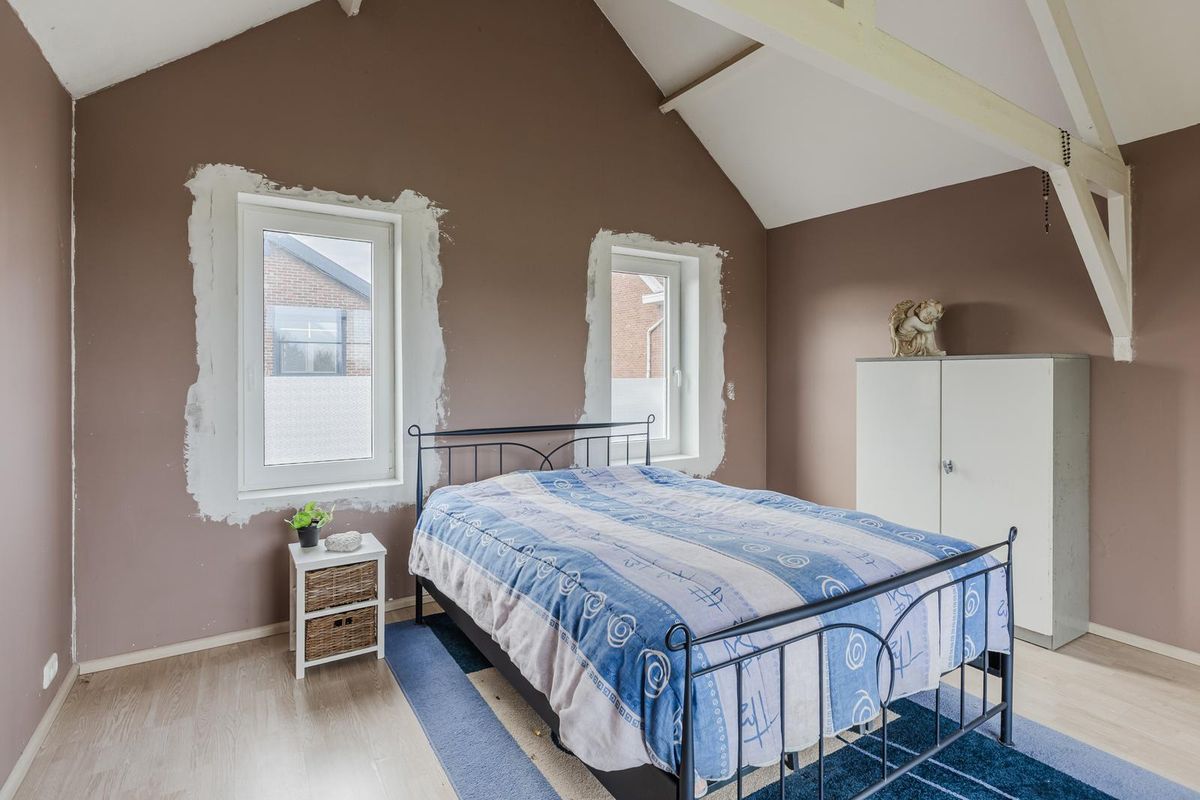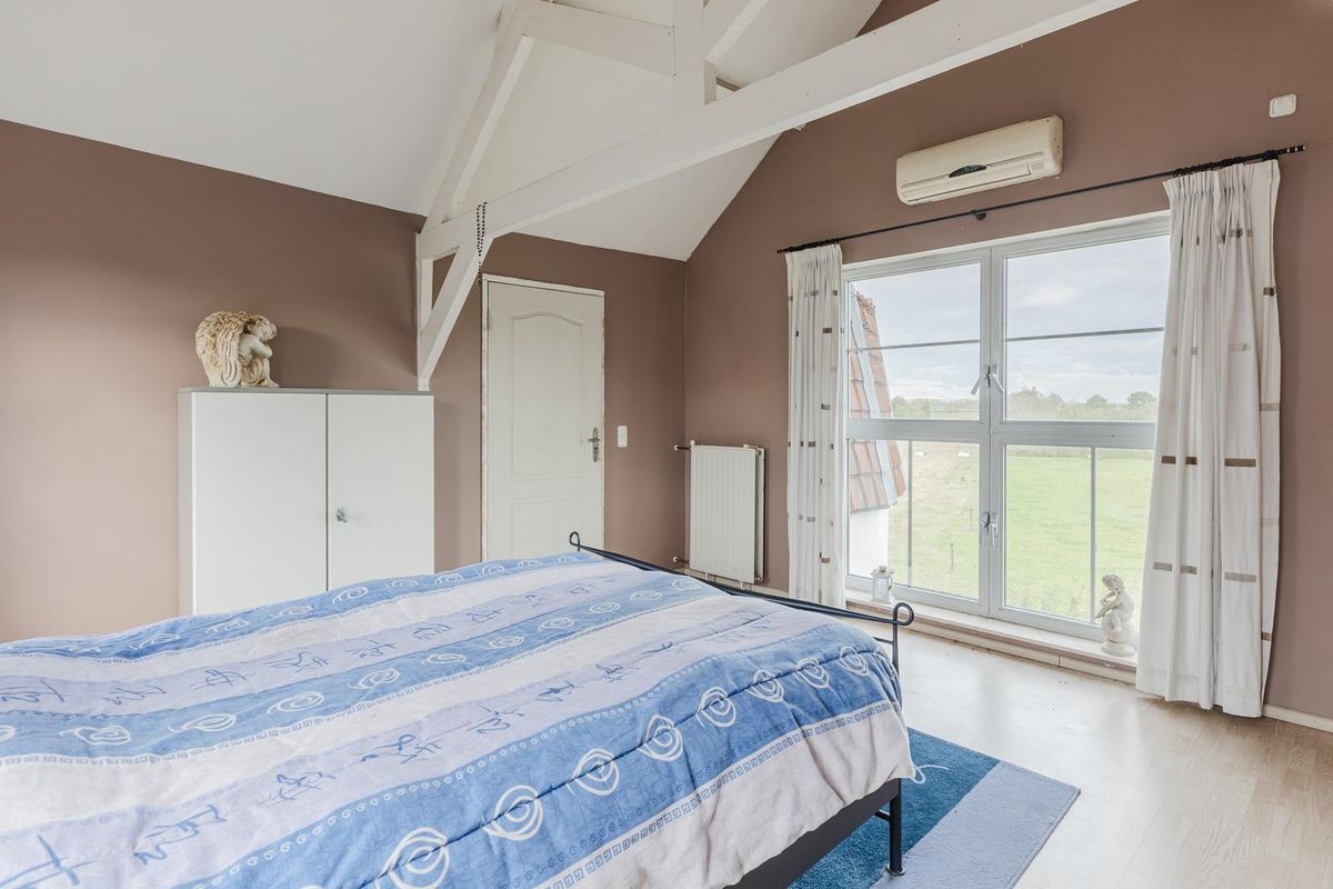 De hoofdslaapkamer is netjes afgewerkt en bijzonder sfeervol door de dakspanten in het zicht. Deze slaapkamer is voorzien van een laminaatvloer, gestucte wanden, sfeervol balken plafond en airconditioning. Vanuit deze slaapkamer heeft u een schitterend uitzicht over het Zeeuwse landschap.