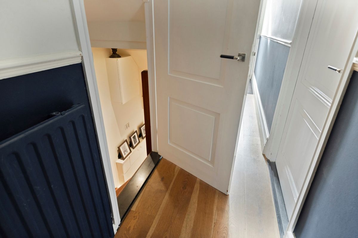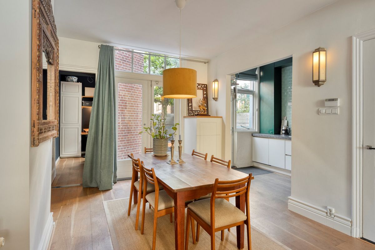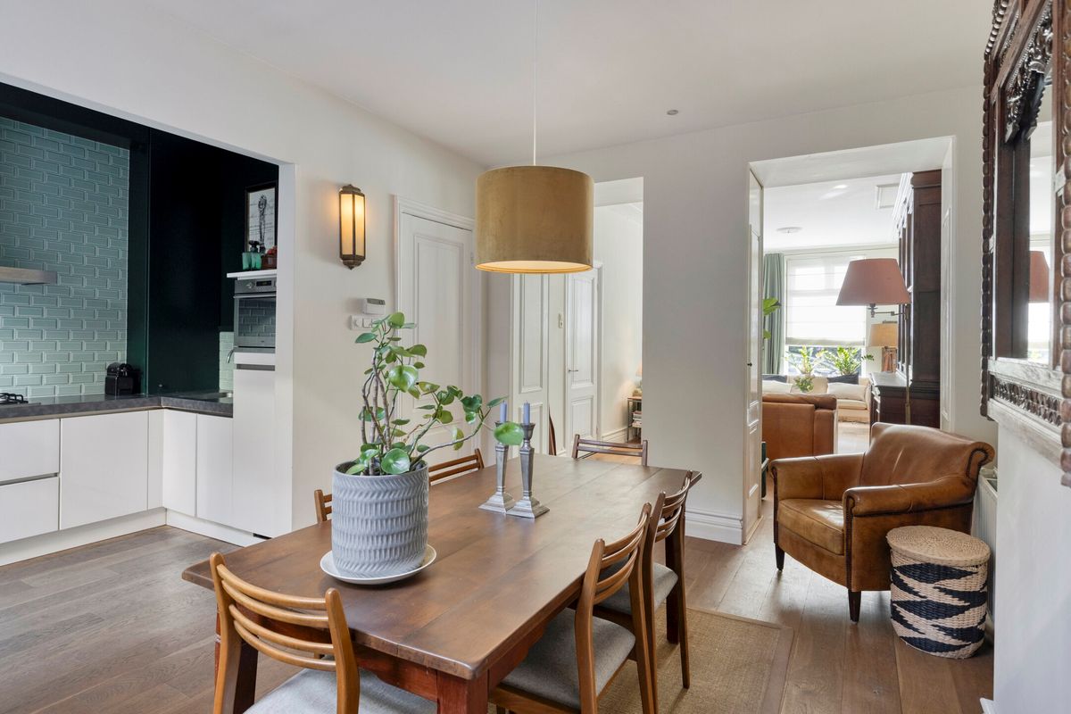 De lange hal, met daarin een wc en een ruime voorraadkast, leidt naar de lichte woonkamer waar het daglicht mooi binnenvalt. De woonkamer en eetkamer zijn subtiel van elkaar gescheiden door een praktische, geïntegreerde kast met stijlvolle houten panelen. In de eetkamer is plek voor een grote tafel, met openslaande deuren naar de tuin – perfect voor gezellige etentjes of een rustig ontbijt in het groen. Aangrenzend vind je de studeerkamer / thuiswerkplek / studio. Deze knusse ruimte met tuinzicht is een heerlijke plek om geconcentreerd te kunnen werken.