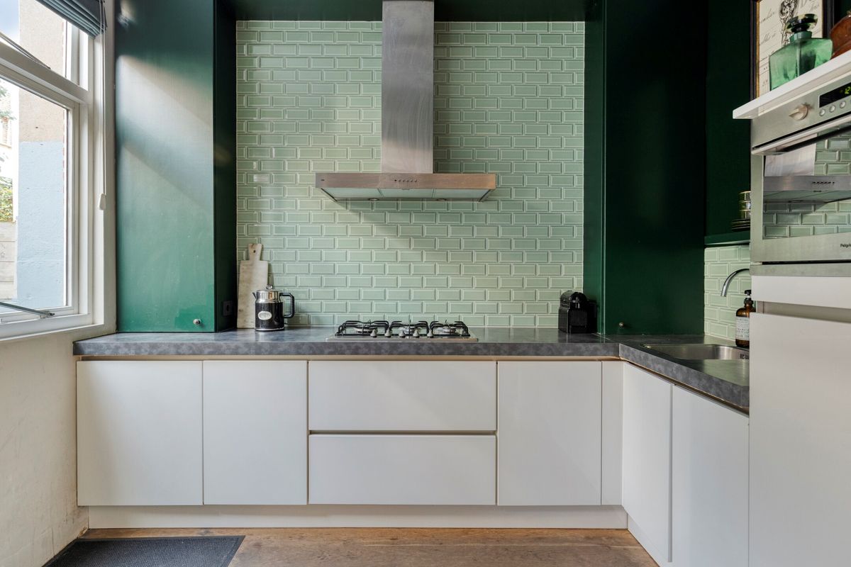 De handige keuken sluit aan op de eetkamer en biedt voldoende opbergruimte. Ook vanuit hier stap je zo de tuin in.
