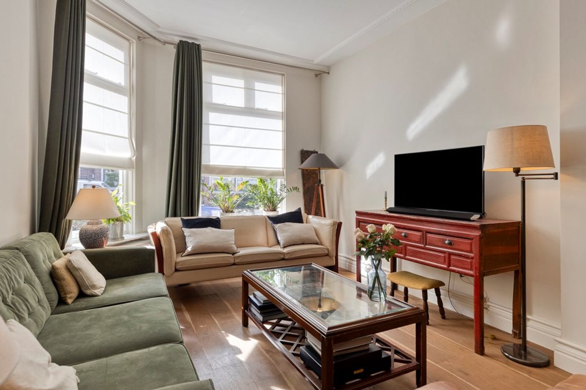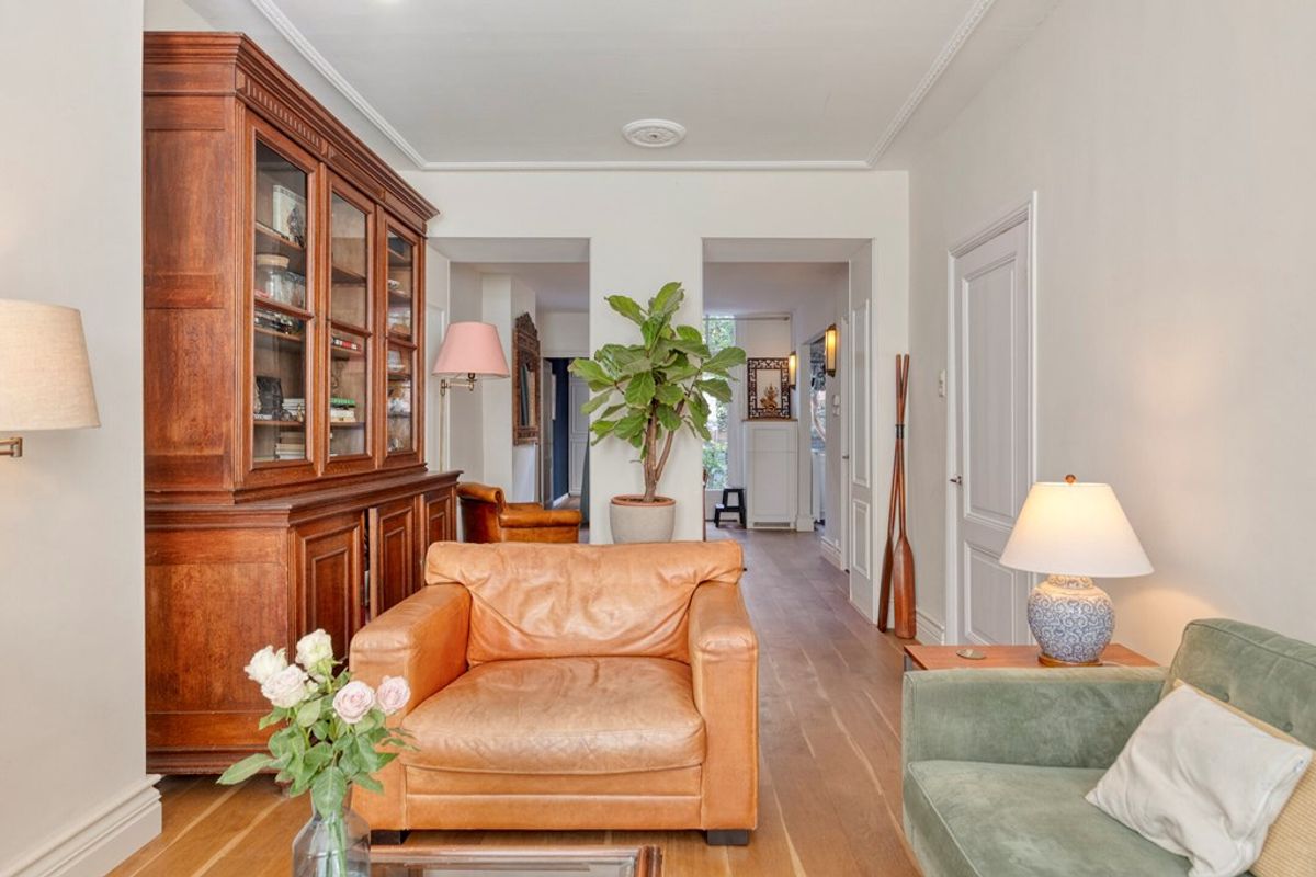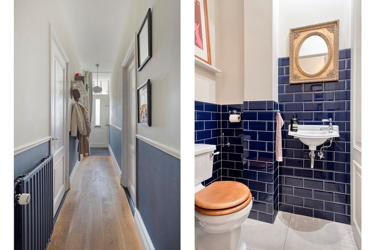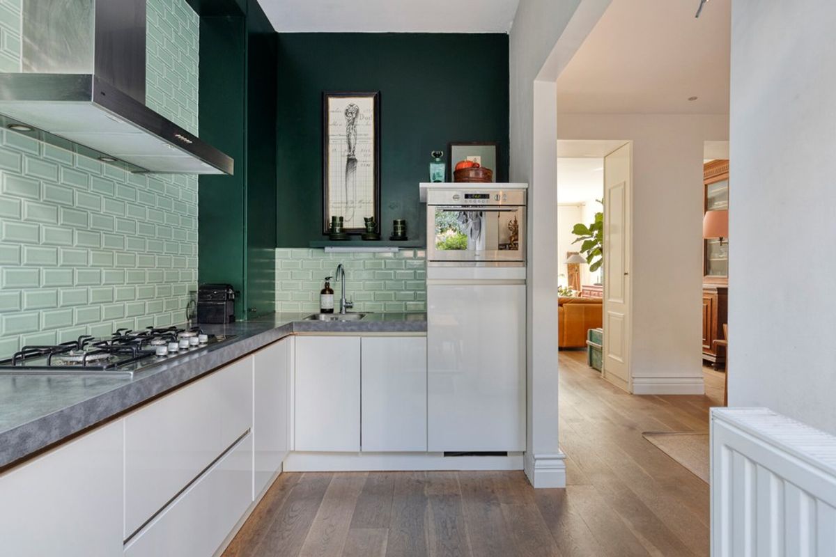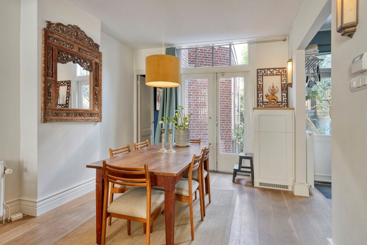 De lange hal, met daarin een wc en een ruime voorraadkast, leidt naar de lichte woonkamer waar het daglicht mooi binnenvalt. De woonkamer en eetkamer zijn subtiel van elkaar gescheiden door een praktische, geïntegreerde kast met stijlvolle houten panelen. In de eetkamer is plek voor een grote tafel, met openslaande deuren naar de tuin – perfect voor gezellige etentjes of een rustig ontbijt in het groen. Aangrenzend vind je de studeerkamer / thuiswerkplek / studio. Deze knusse ruimte met tuinzicht is een heerlijke plek om geconcentreerd te kunnen werken.