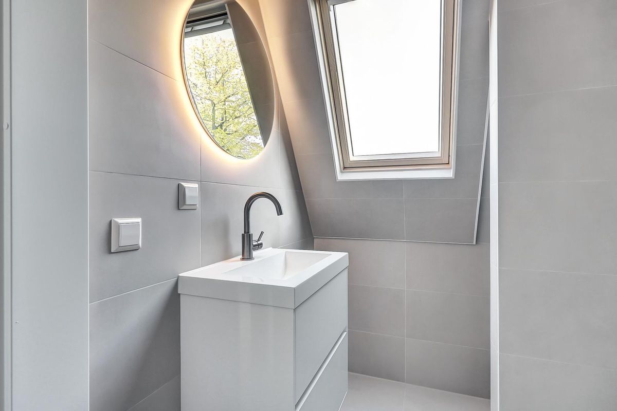 Moderne badkamer met douche, wastafel en wasmachineaansluiting