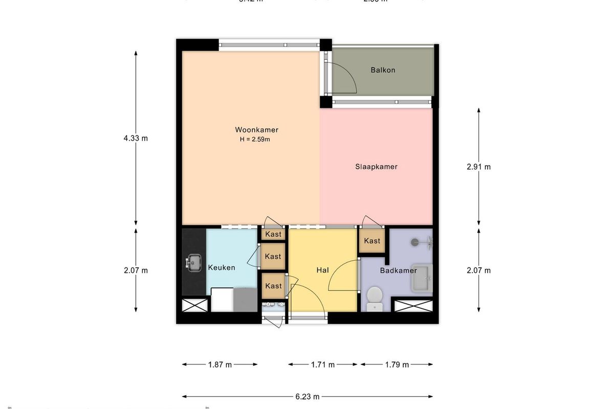 Entree in de hal van het appartement. Toegang tot de woonkamer/keuken en badkamer. De lichte woon-/slaapkamer (ca. 24m2) is gelegen aan de achterzijde en geeft toegang tot de keuken en het balkon. De vloer is voorzien van een witte plavuizenvloer. De eenvoudige keuken is uitgevoerd in het wit. Hier tref je tevens de aansluiting van de wasmachine en heb je toegang tot een vaste kast waar de boiler zich bevindt.