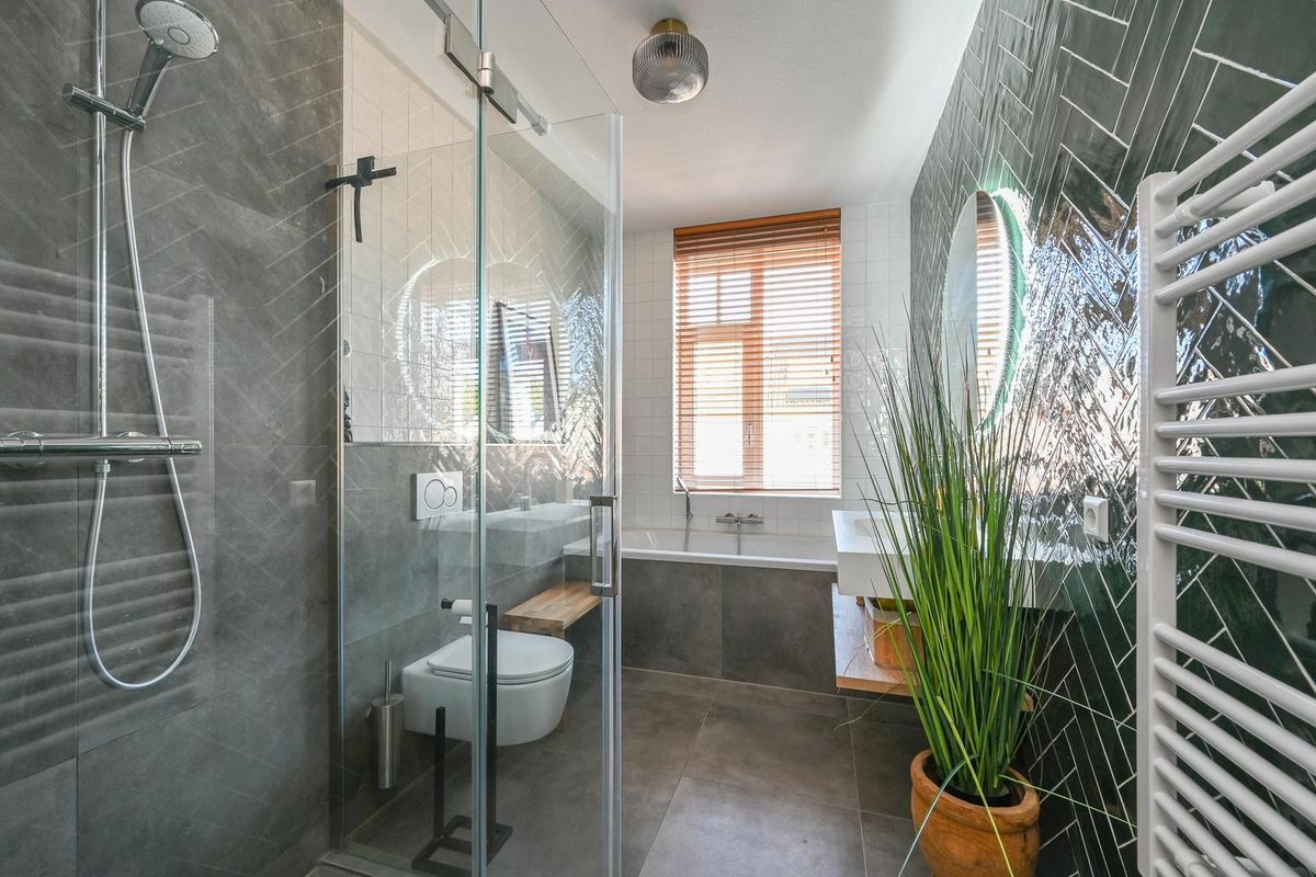 De smaakvolle en volledig betegelde badkamer is luxe en smaakvol uitgevoerd. U vindt hier een comfortabel ligbad, een royale douchegelegenheid, een breed wastafelmeubel, een handdoekenradiator en een tweede toilet met hangcloset en inbouwreservoir.