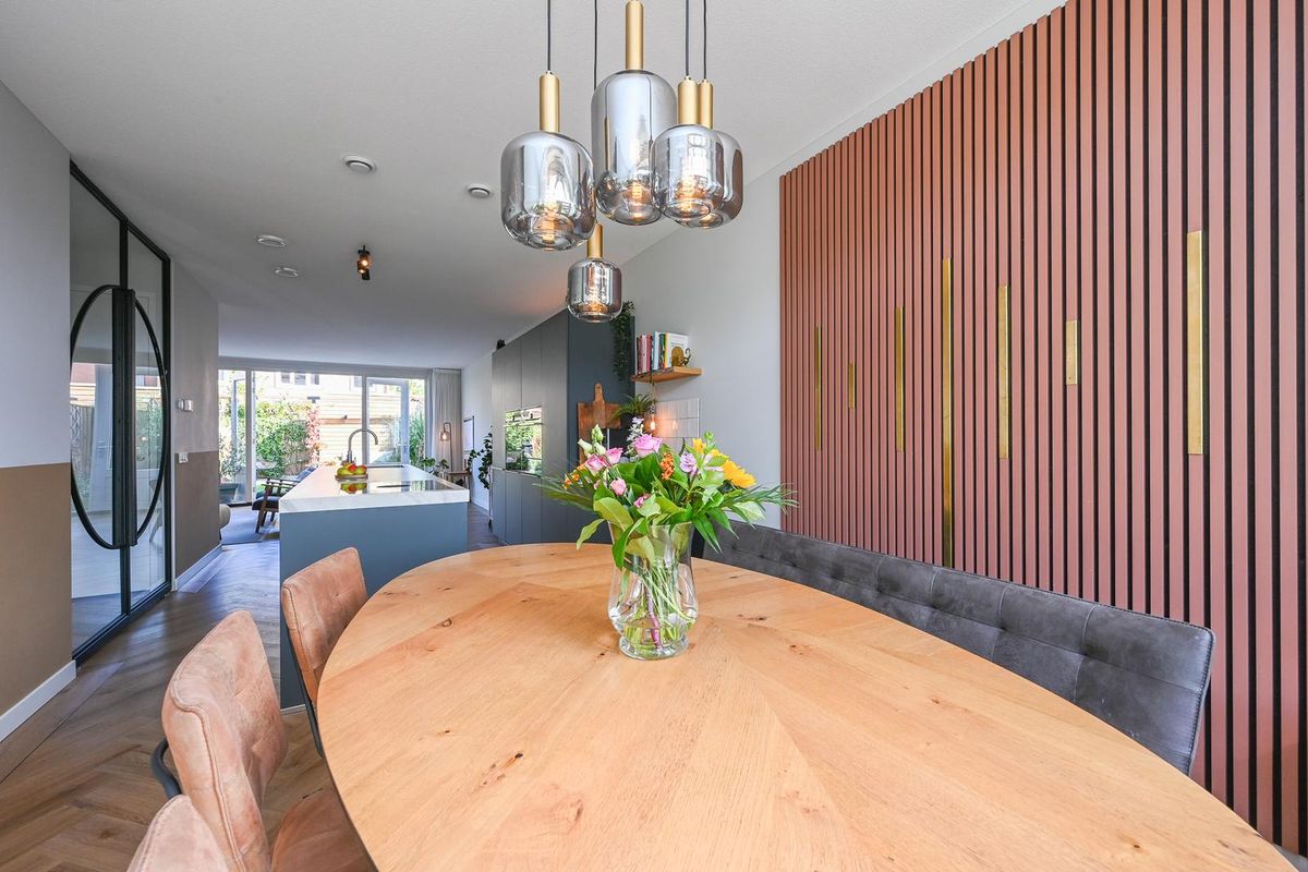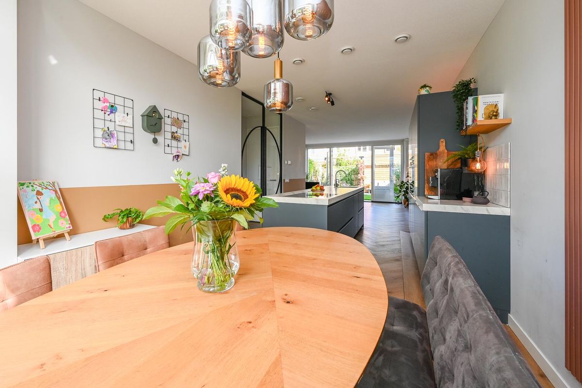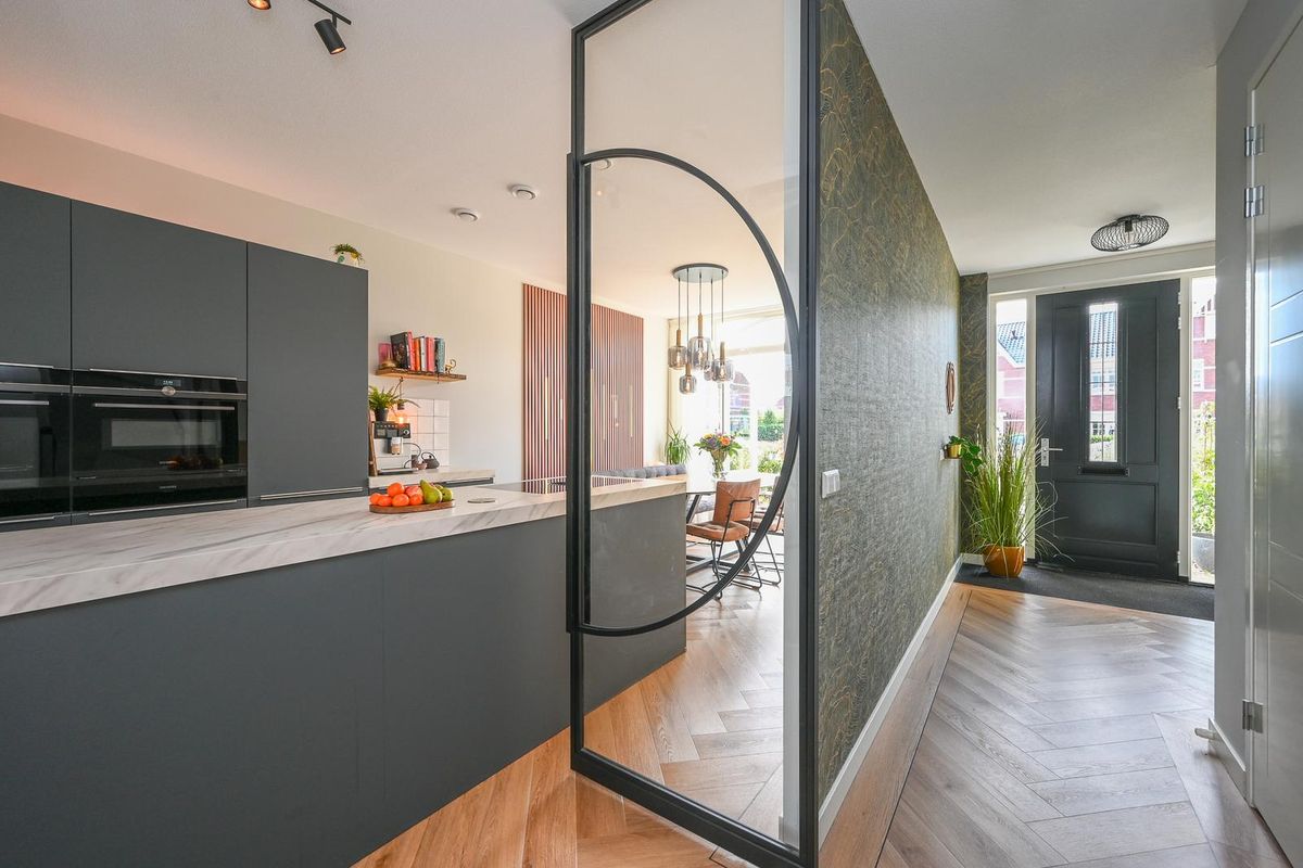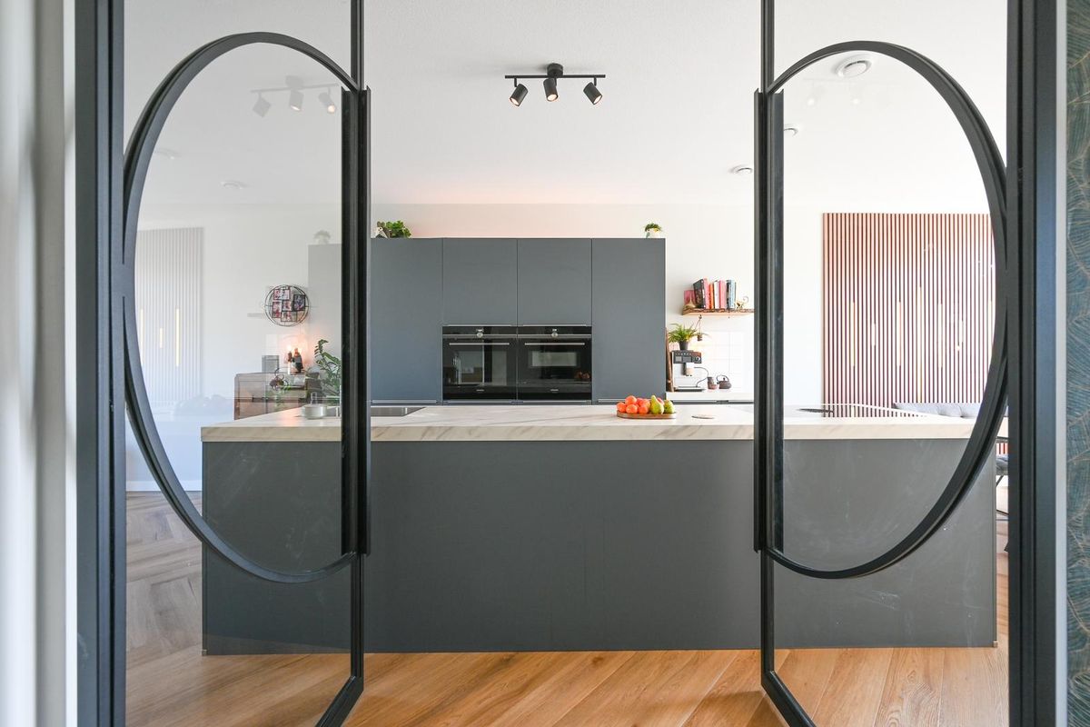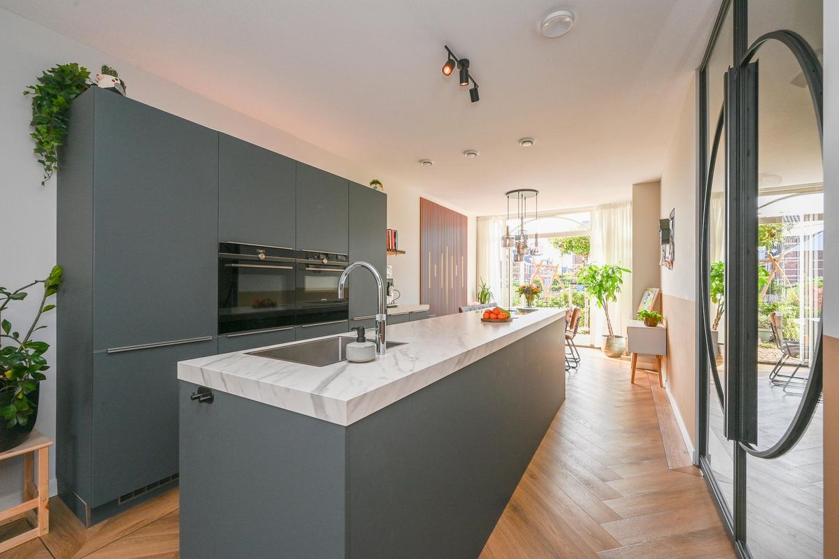 Het kloppend hart van de woning is de prachtige open keuken met een royaal kookeiland, voorzien van veel kastruimte en gecombineerd met een strakke kastenwand.