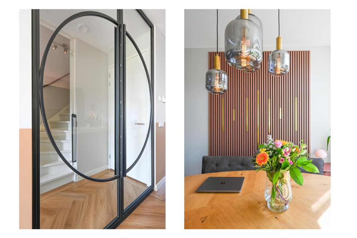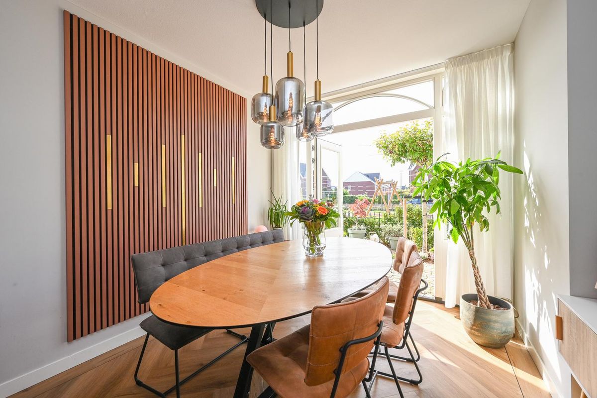De aangrenzende eetkamer, deels voorzien van stijlvolle wandpanelen, biedt via openslaande deuren toegang tot de voortuin, een heerlijke plek om te genieten van de middag- en avondzon met uitzicht op de brede groenstrook.