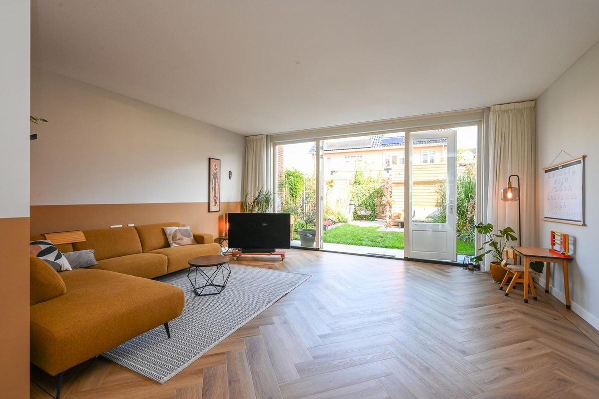 De verzorgde voortuin verwelkomt u stijlvol, waarna u binnenkomt in een lichte en ruime living met een prachtige visgraatvloer en openslaande deuren naar de zonnige achtertuin. Hier geniet u in alle rust van privacy en groen.