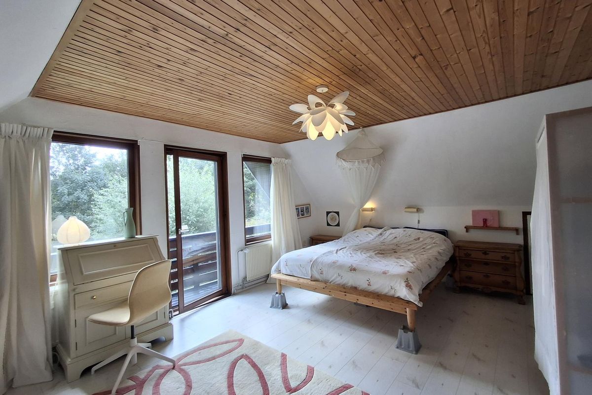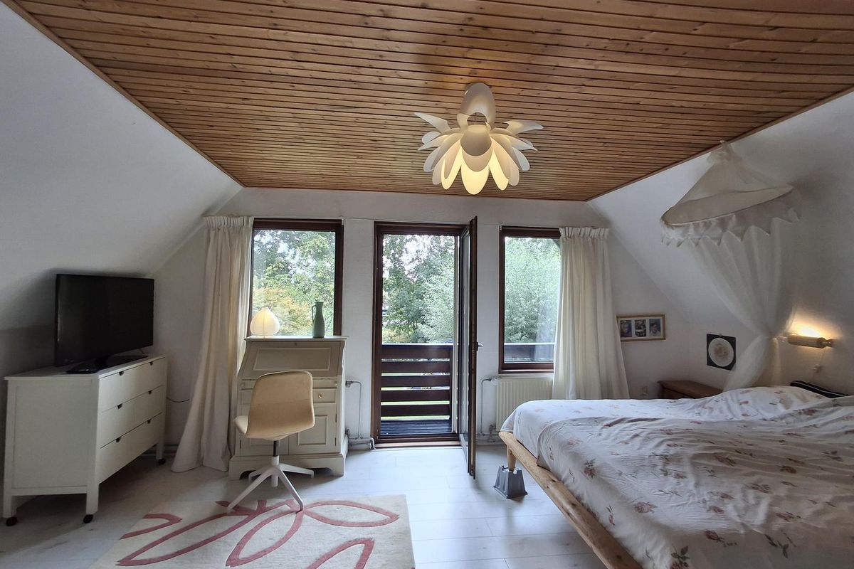 Op de eerste etage bevinden zich drie slaapkamers. Twee slaapkamers zijn voorzien van een tweepersoonsbed en kastruimte, de derde slaapkamer is ingericht als werkkamer. De ruime badkamer beschikt over een inloopdouche, ligbad, toilet en wastafelmeubel.