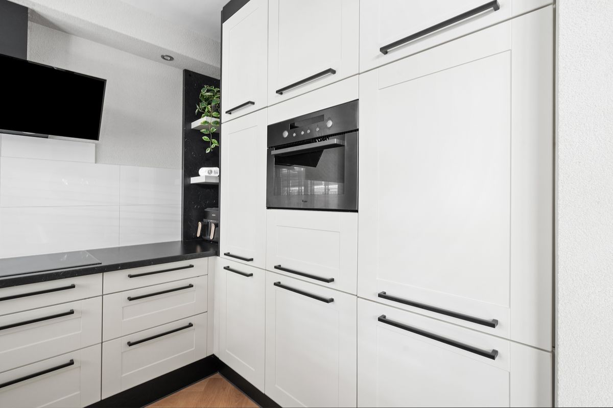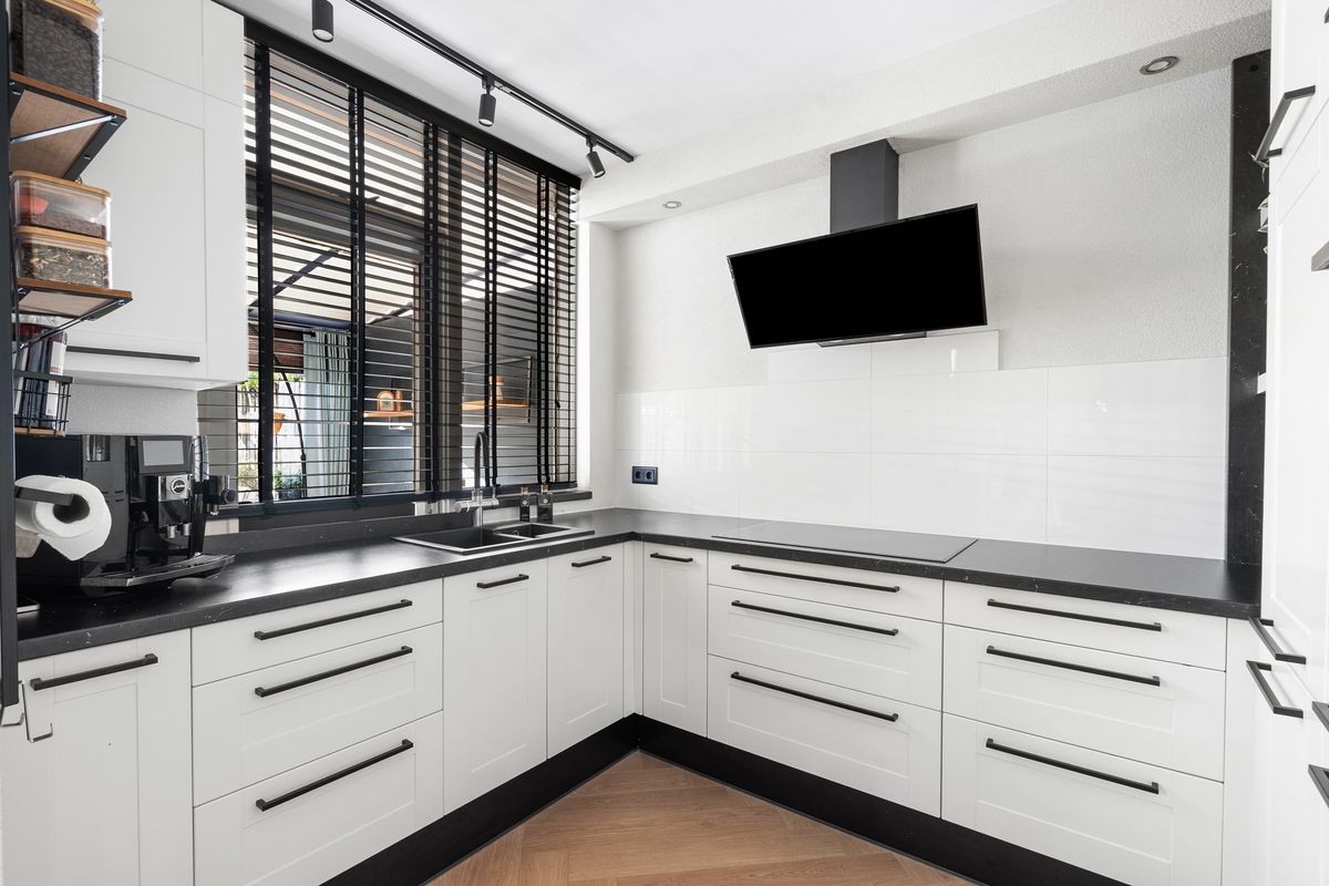 The living room features a spacious sitting area with an air conditioner and a dining area directly connected to the U-shaped kitchen. The kitchen is fully equipped with all conceivable conveniences. From the dining area, a folding door leads to the conservatory, which has a polycarbonate roof and a glass sliding door, allowing access to the terrace from early spring to late autumn. This is also possible because an air conditioner (one of five in the house) can heat the space. There is also a pantry under the stairs, which houses the electrical panel with a modern circuit board and the fiber-optic internet connection.
