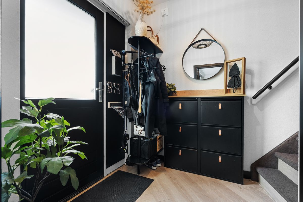 Hallway with access to the guest toilet, staircase to the upper floors, and entry into the living room. The entire ground floor is equipped with underfloor heating and a maintenance-free herringbone laminate floor.