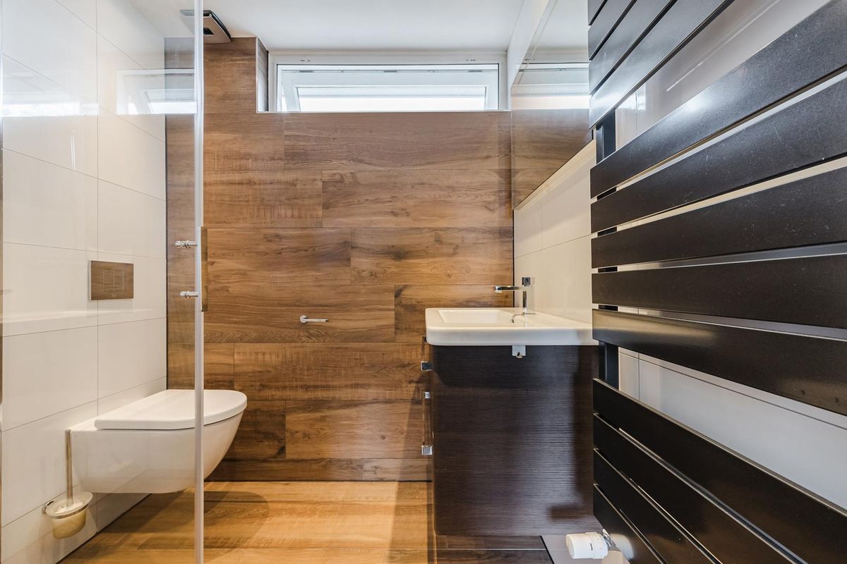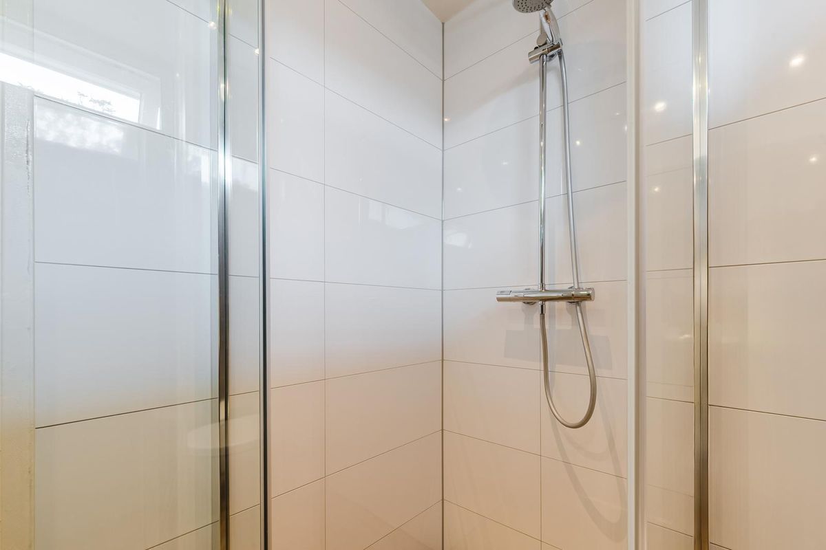 De badkamer is praktisch ingericht, voorzien van een moderne wastafel, douche, zwevend toilet en een design radiator.