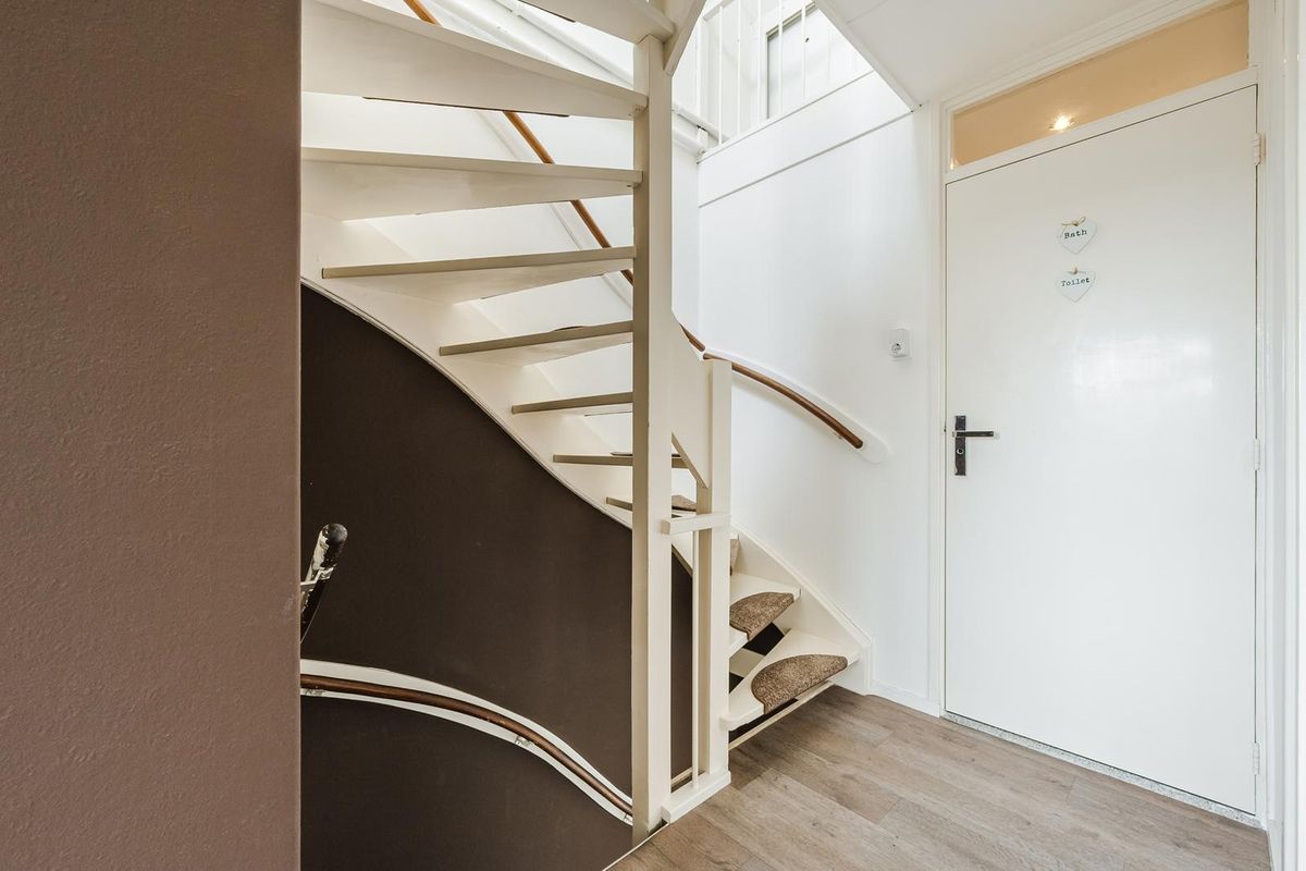 Ruime overloop met opstelplaats van de Cv-ketel, aansluitingen voor de wasmachine en wasdroger en de omvormer van de zonnepanelen. De overloop is voorzien van een dakraam, waardoor er veel natuurlijk lichtinval ontstaat en is er toegang tot bergingsruimte achter de schotten.