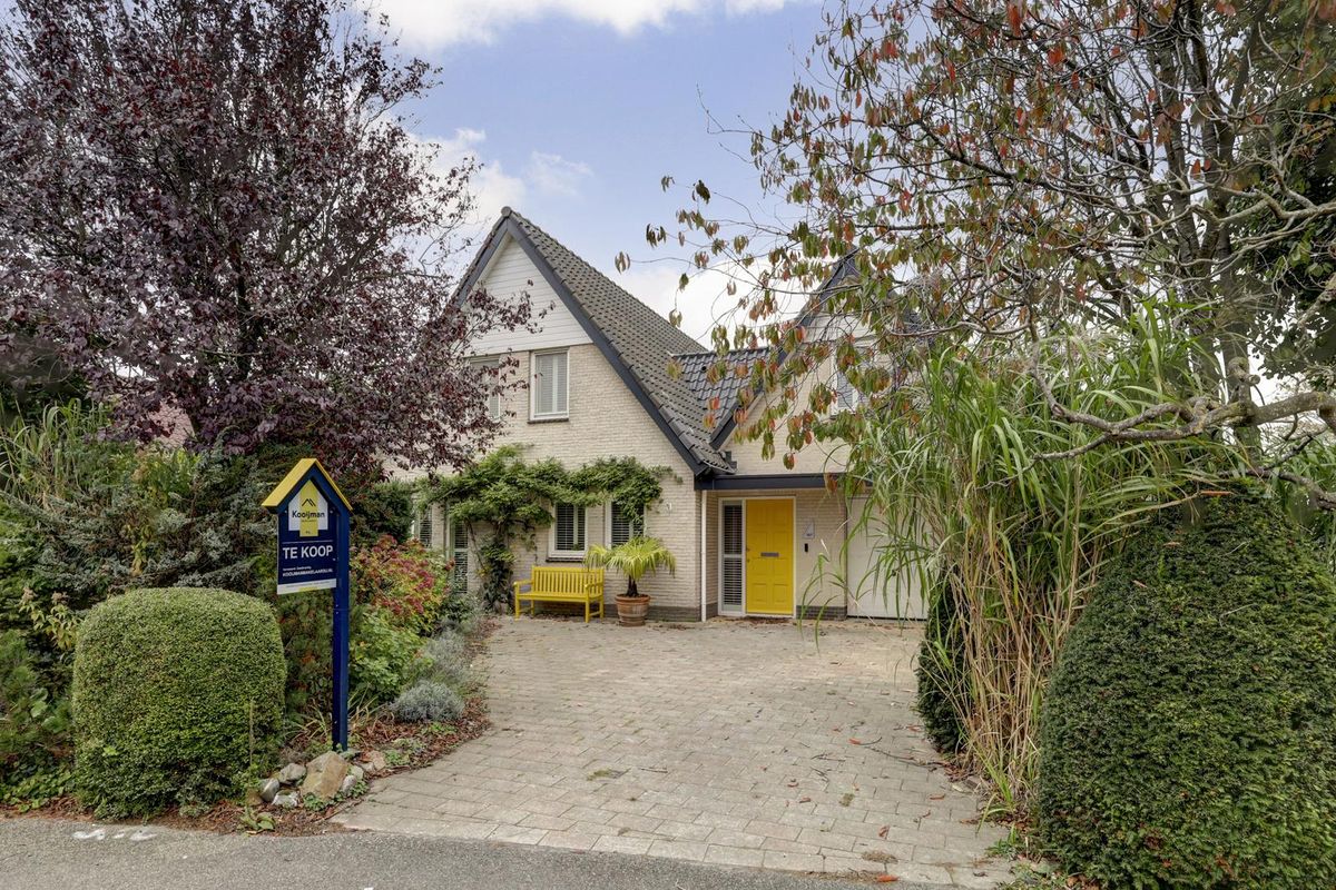 De voorgevel straalt karakter uit, een frisse lichtsteen, donkergroene dakpannen en een zonnig gele voordeur met bijpassende bank vormen samen een charmant welkom. De ruime oprit biedt plaats aan meerdere auto’s en leidt naar de inpandige garage.