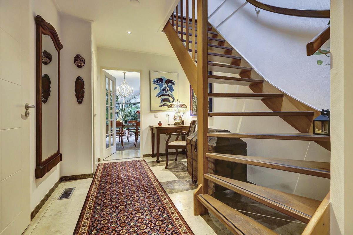Binnen wordt u ontvangen in de lichte hal met marmeren vloer, trapopgang en garderobe. Vanuit hier bereikt u de diverse vertrekken.