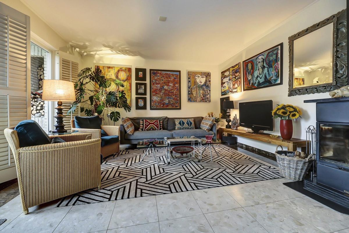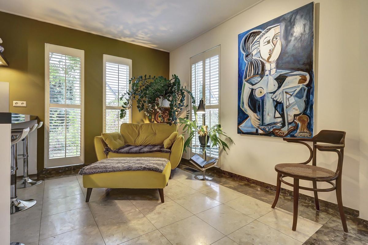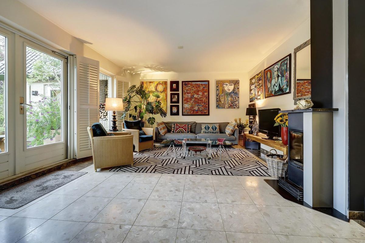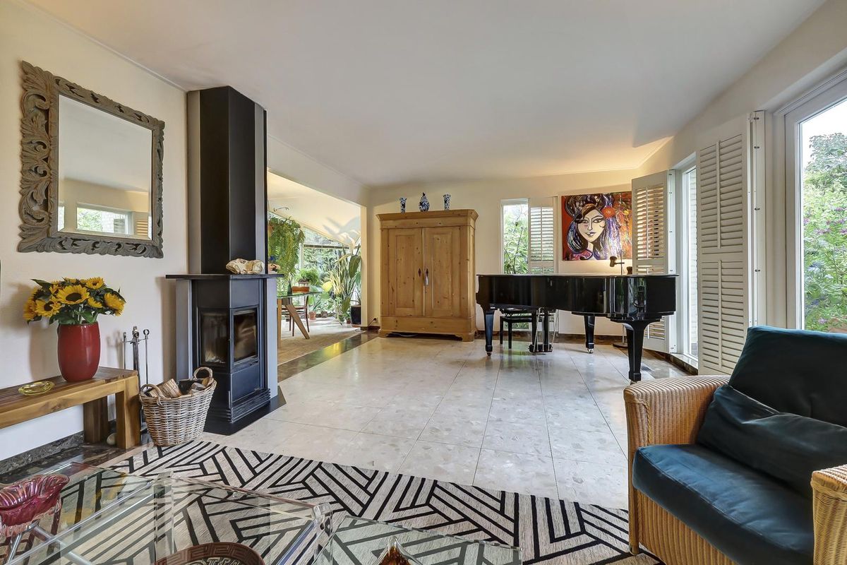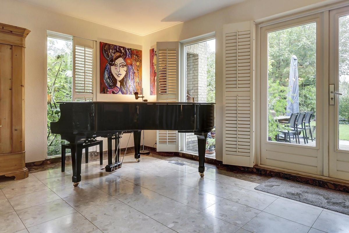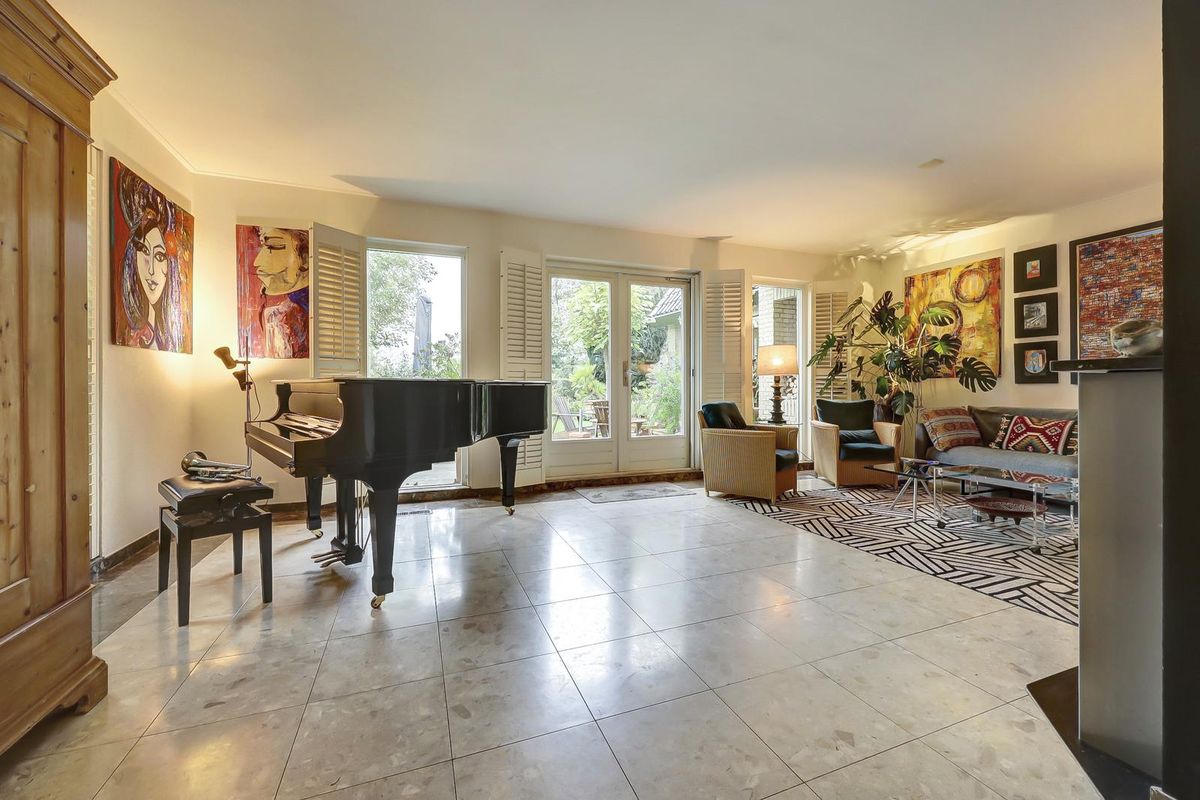 De woonkamer is een heerlijke, sfeervolle ruimte met grote ramen voorzien van elegante shutters en openslaande deuren naar de tuin. De marmeren vloer, het warme kleurgebruik en de moderne haard zorgen voor een uitnodigende ambiance. De shutters zorgen voor een aangename lichtinval en privacy, terwijl de zithoek met uitzicht op de tuin plaats biedt aan een comfortabele inrichting. De vleugel en kunstwerken geven het geheel een artistieke uitstraling.