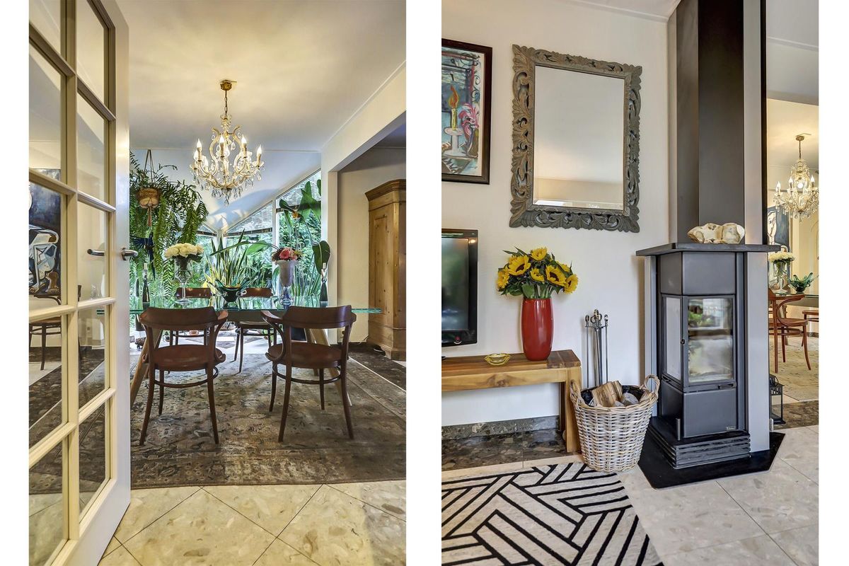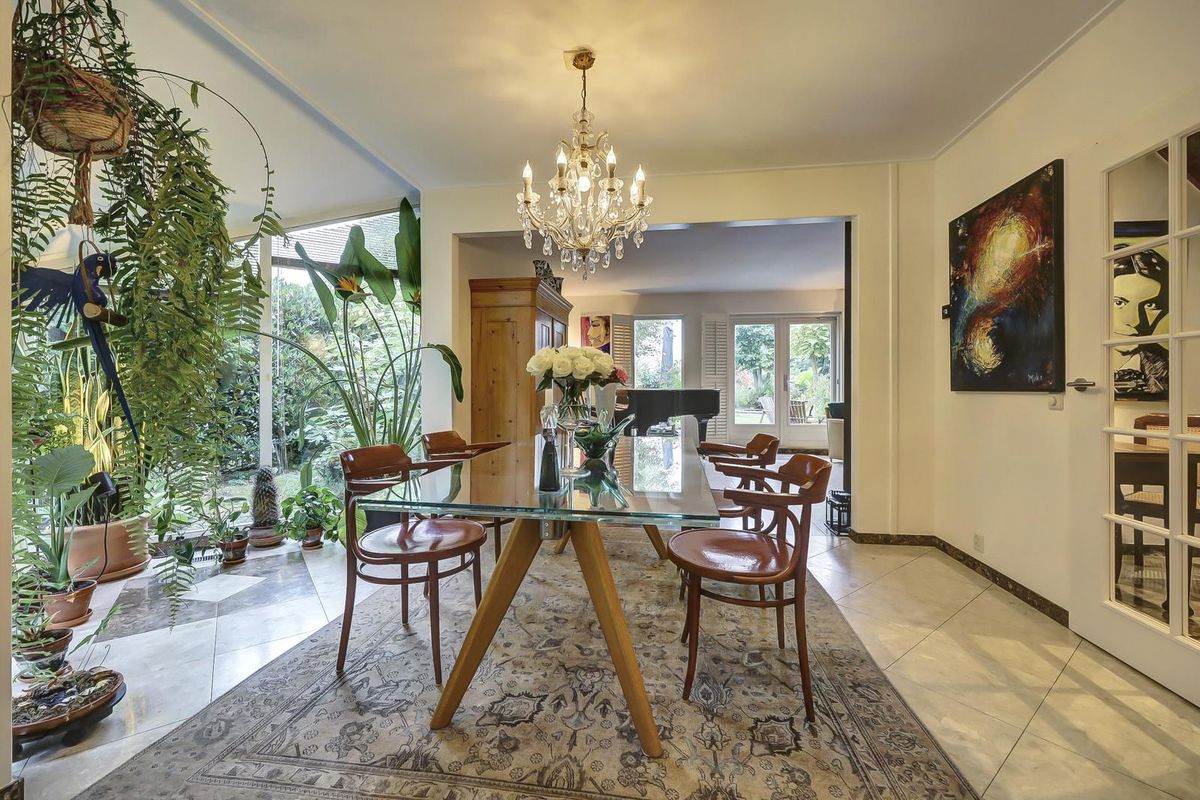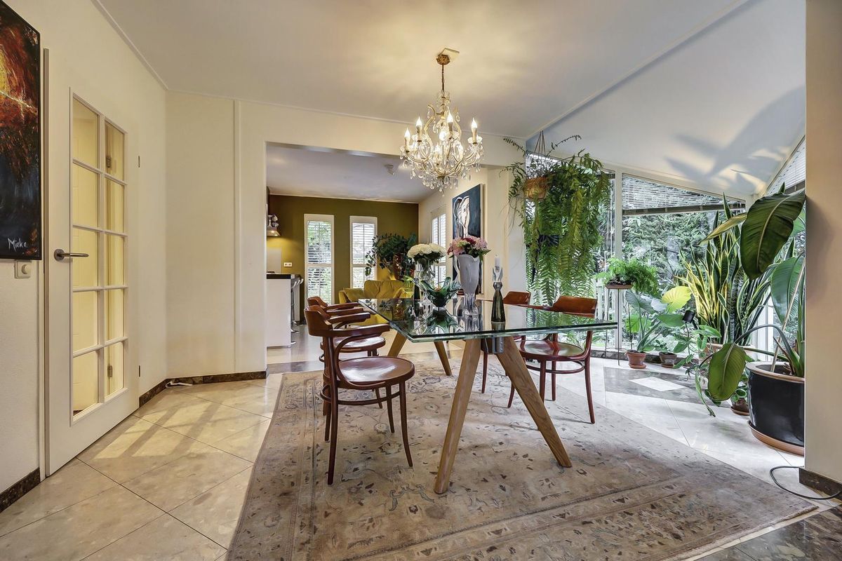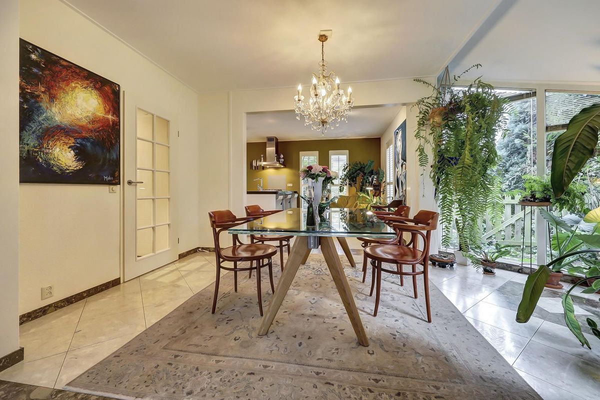 De eetkamer in de serre sluit naadloos aan en profiteert van de grote raampartijen en openslaande deuren richting het terras. De glazen eettafel, de kroonluchter en het groen rondom creëren een stijlvolle en natuurlijke eetruimte.