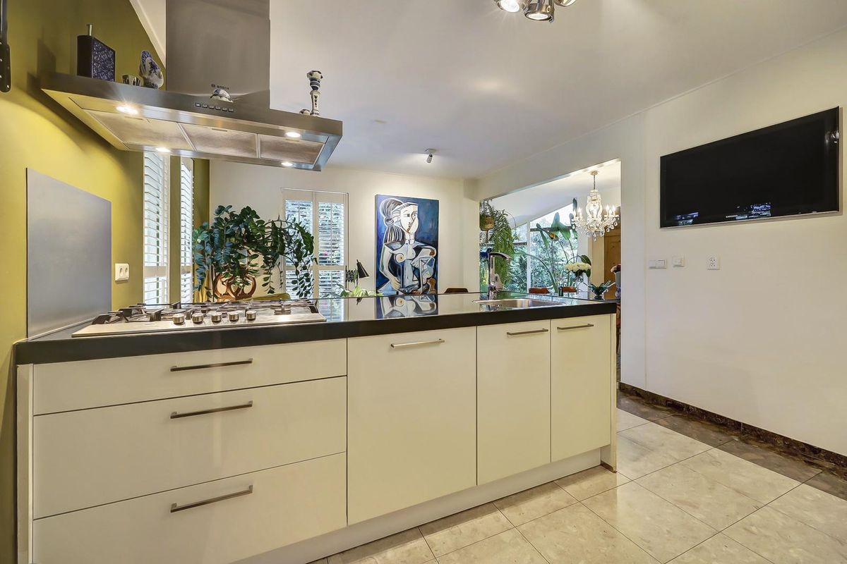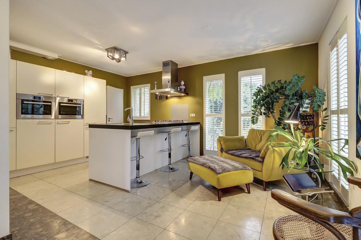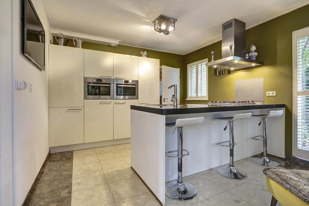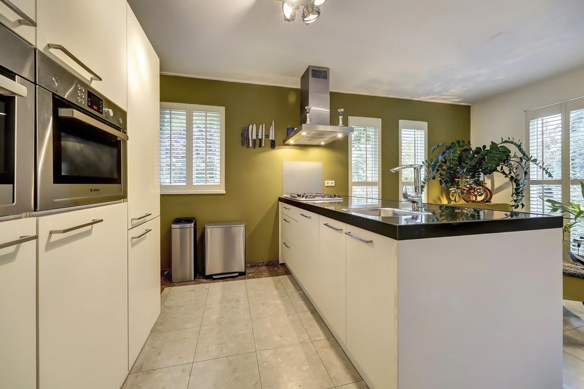 Als u verder loopt bereikt u de keuken. De keuken is modern en strak uitgevoerd met een kookeiland, witte fronten en een donker werkblad. De olijfgroene wanden geven een warme, eigentijdse uitstraling. Ook hier zorgen de fraaie shutters voor een stijlvolle afwerking en aangename lichtinval. De keuken is voorzien van hoogwaardige inbouwapparatuur, waaronder een oven, combimagnetron en gaskookplaat met afzuigkap. Vanuit de keuken heeft u direct toegang tot de bijkeuken met aansluitingen voor wasapparatuur en extra opbergruimte!