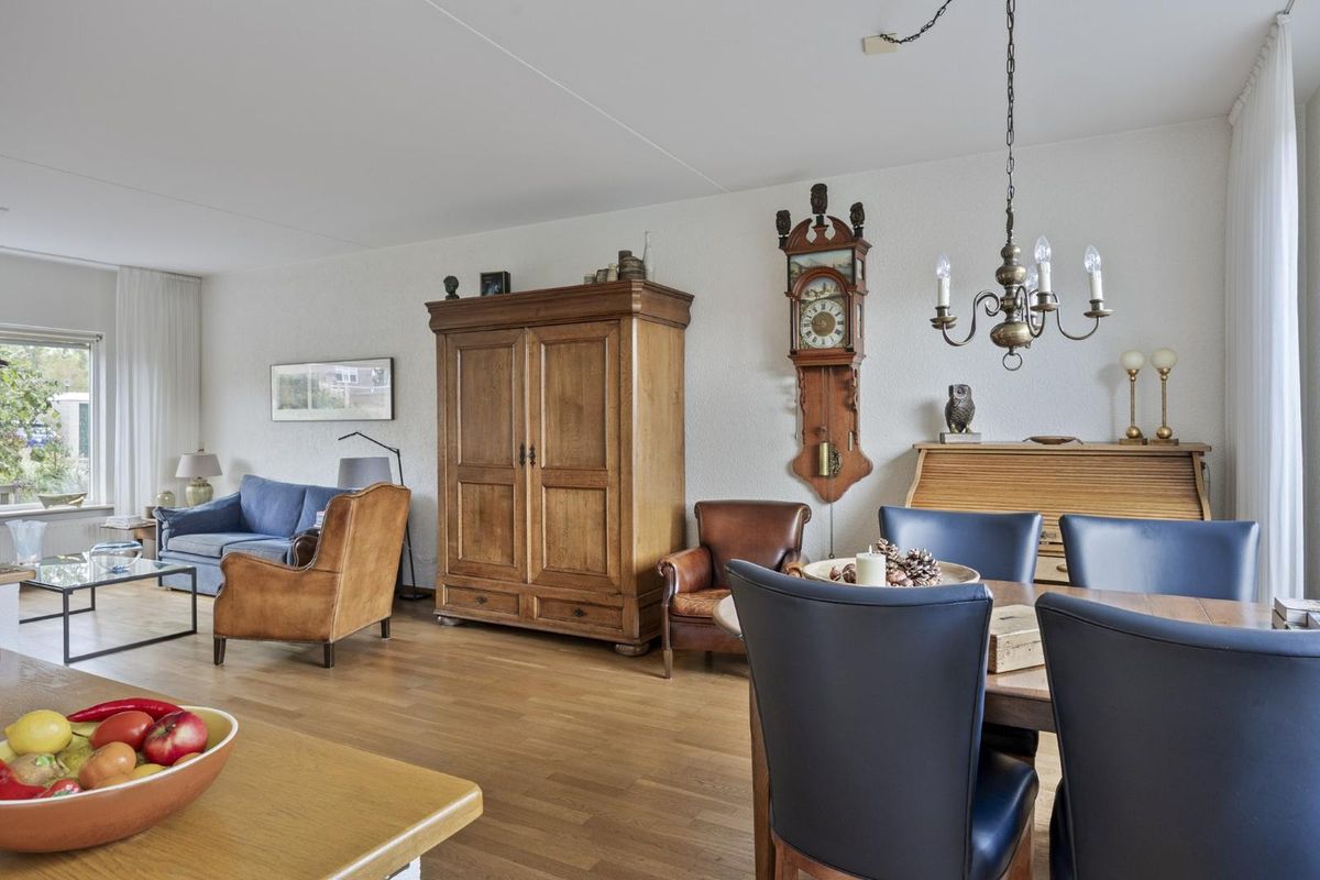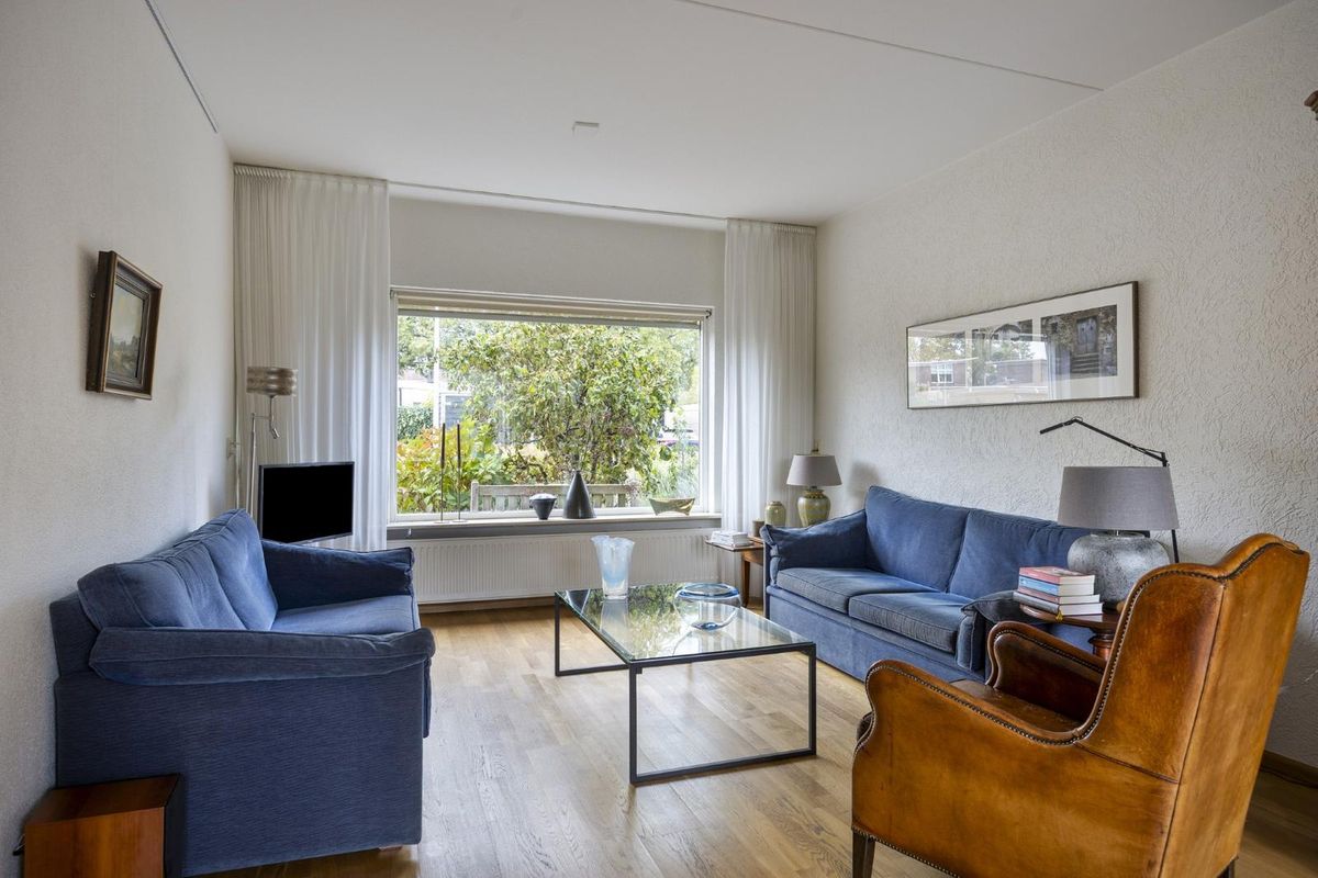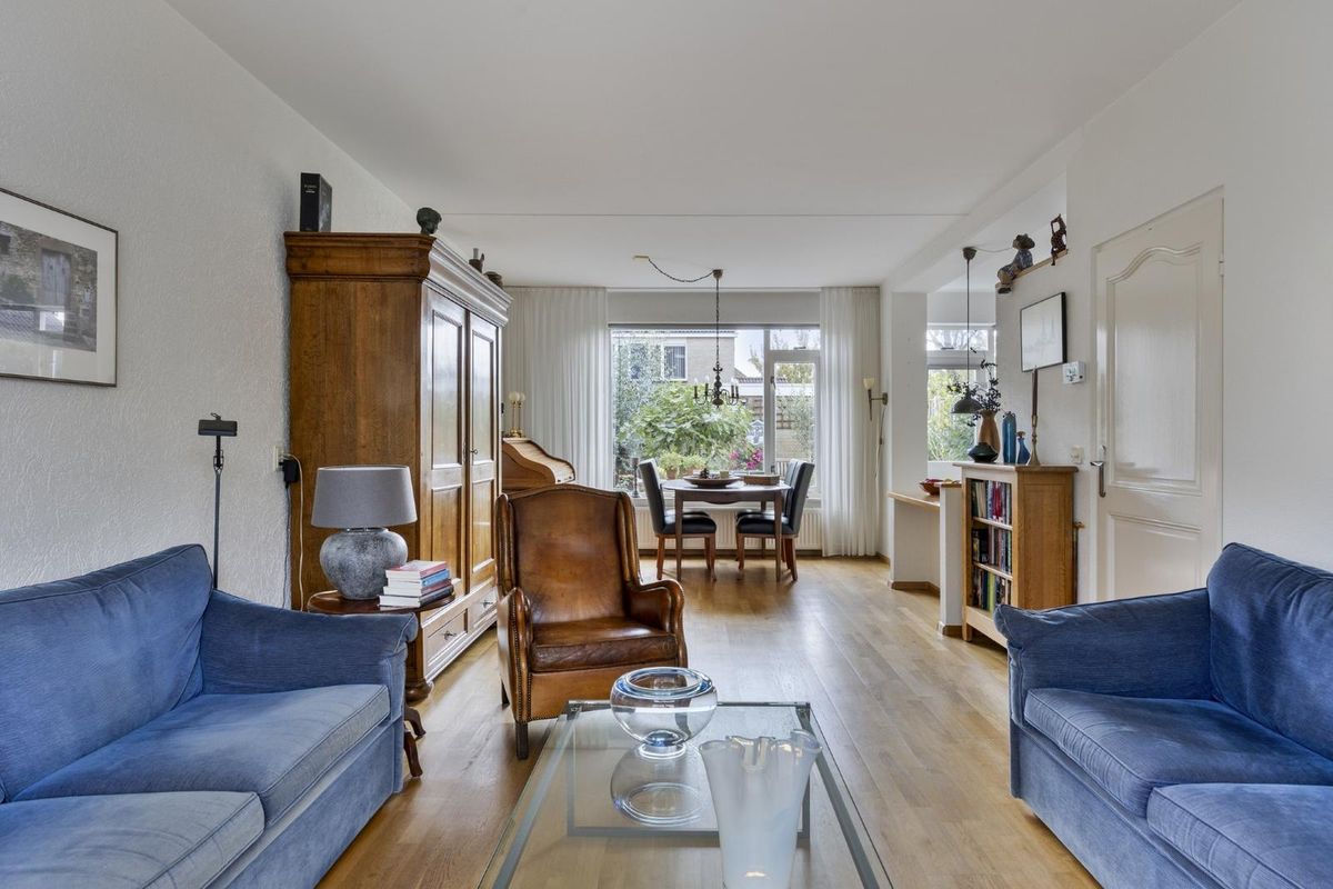 De woonkamer heeft een prettige lengte en indeling met ruimte voor een gezellige zithoek aan de voorzijde en een eethoek richting de tuin.