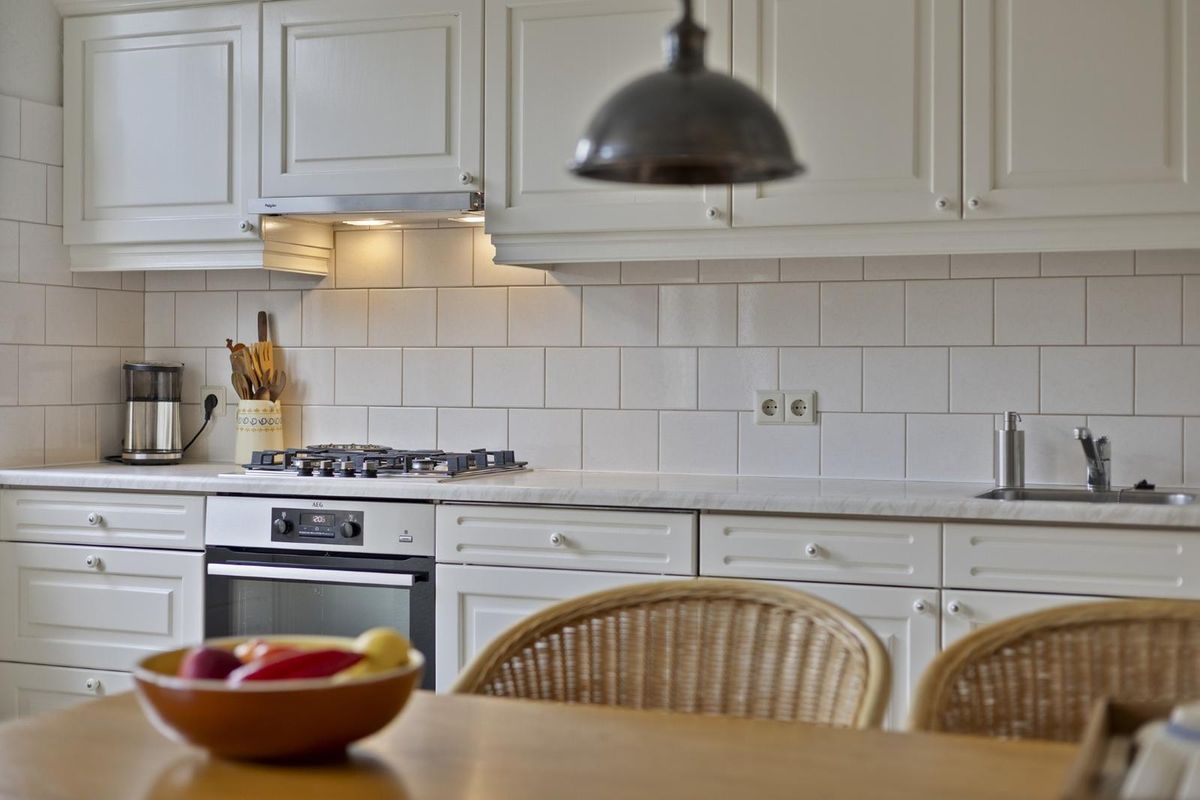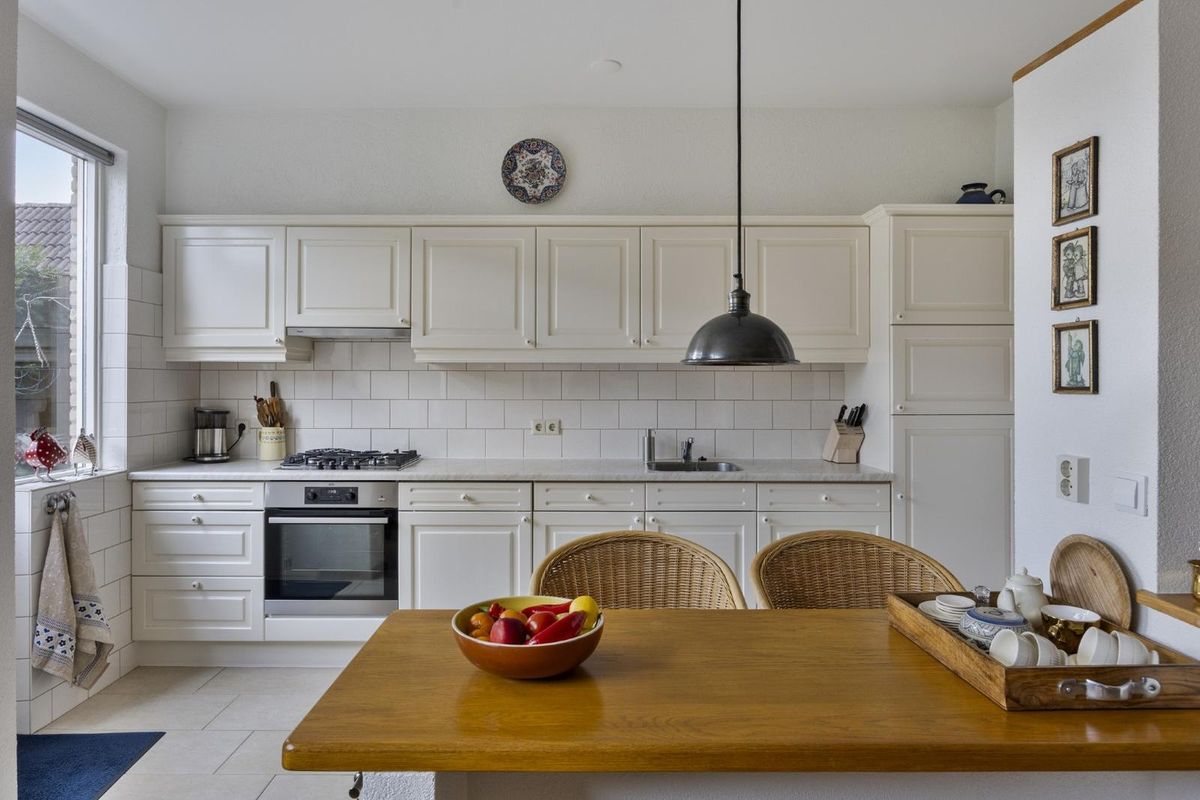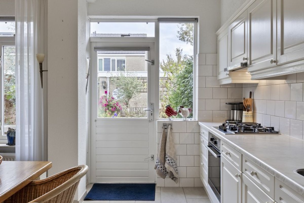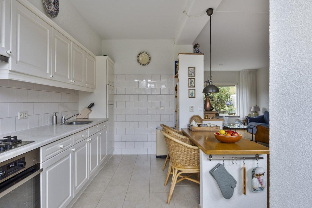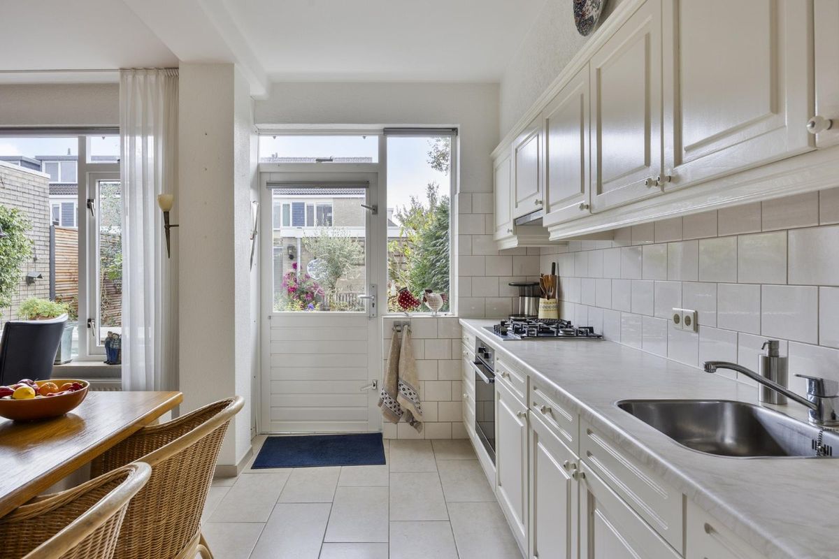 De keuken ligt aan de achterzijde en is verzorgd uitgevoerd met onder andere een gaskookplaat, afzuigkap, oven, magnetron, koel-vriescombinatie en vaatwasser.