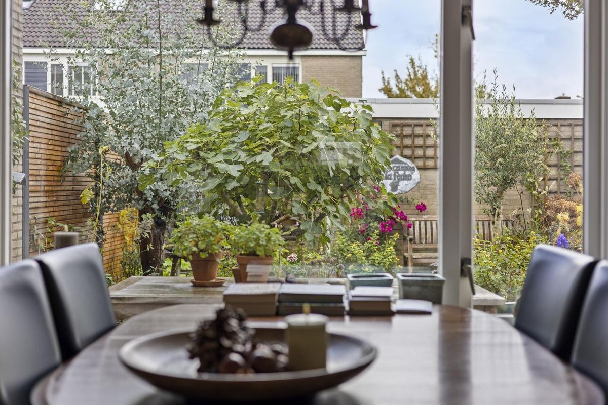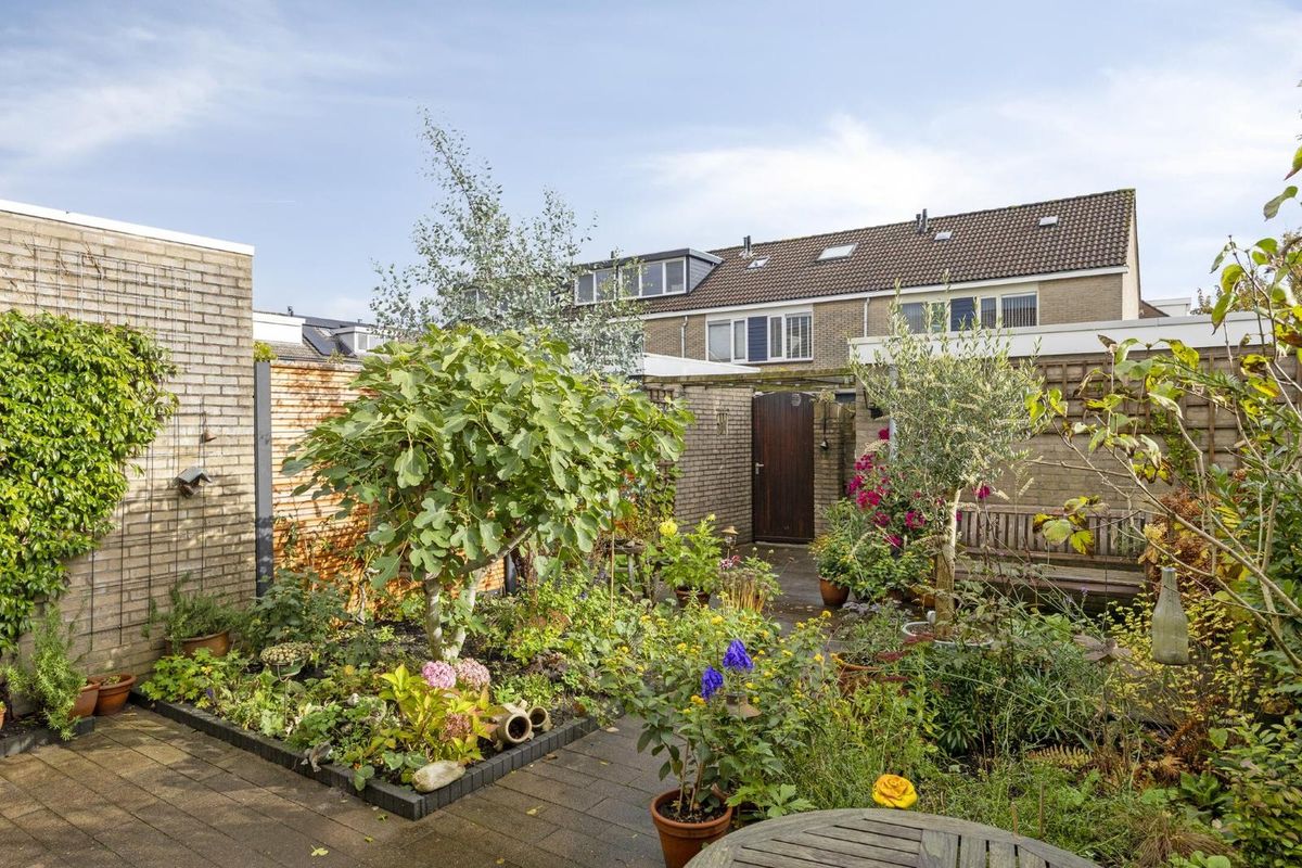 Achter de woning ligt een diepe, verzorgde en kleurrijke tuin op het oosten, waar de ochtendzon je elke dag verwelkomt. Hier geniet je van het eerste kopje koffie in het zonlicht en later op de dag van een fijne plek in de schaduw.