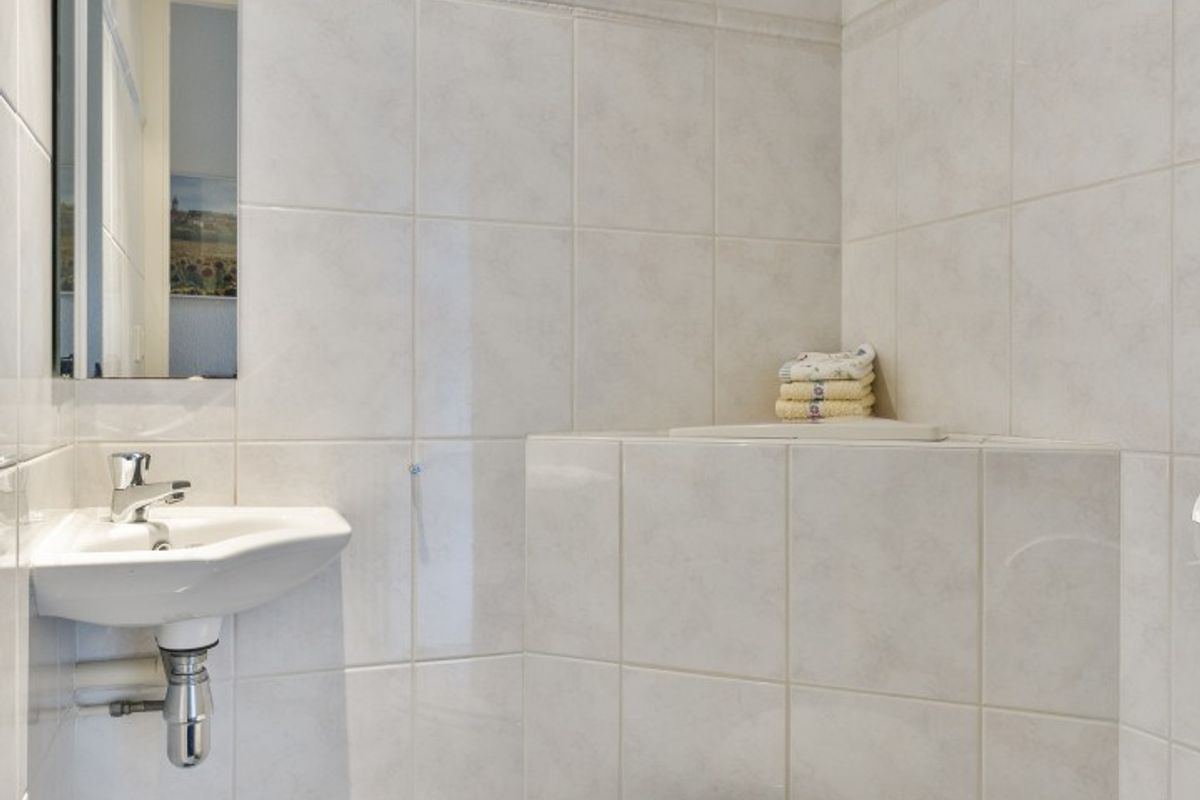 De badkamer is netjes onderhouden en uitgevoerd met een douche, wastafel en tweede toilet.