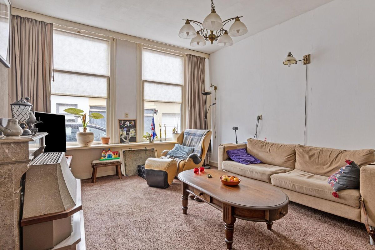 Aan de voorzijde ligt de woonkamer, een lichte ruimte met hoge ramen en een schouw die direct sfeer toevoegt.