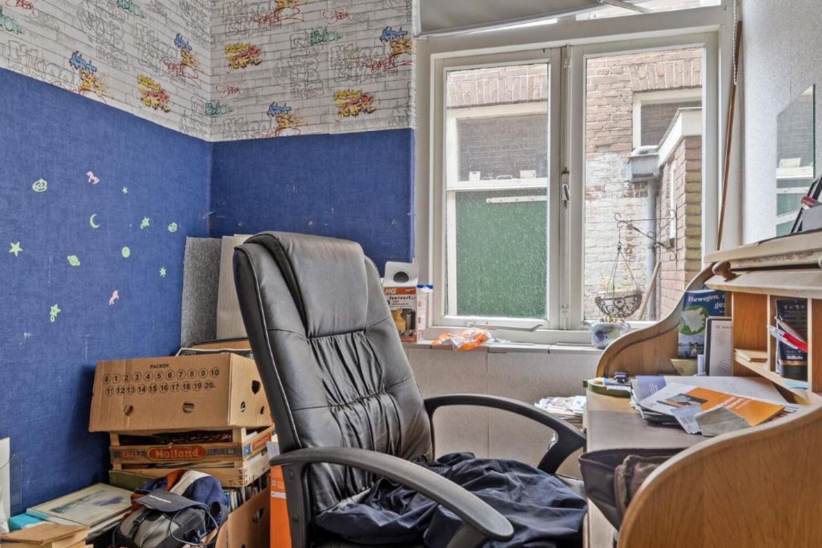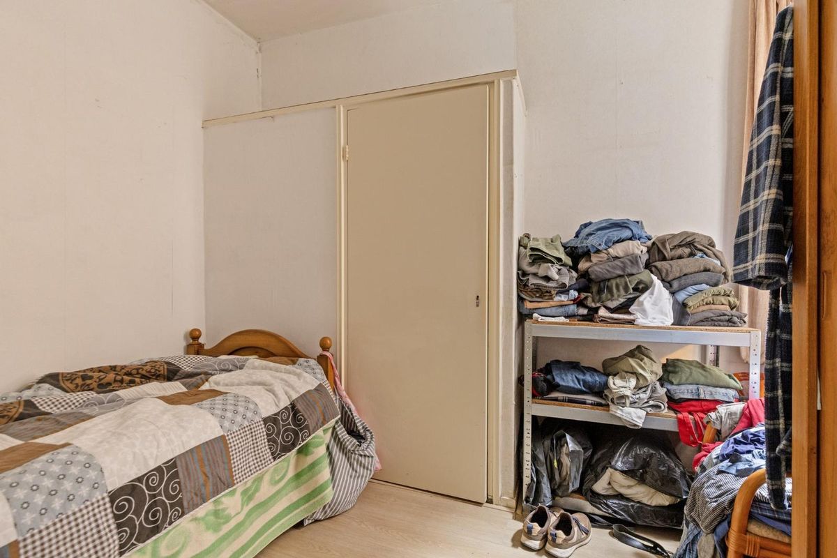 Aansluitend aan de woonkamer bevindt zich de eerste slaapkamer – een knusse kamer die ook goed dienst kan doen als werkkamer of logeerkamer.