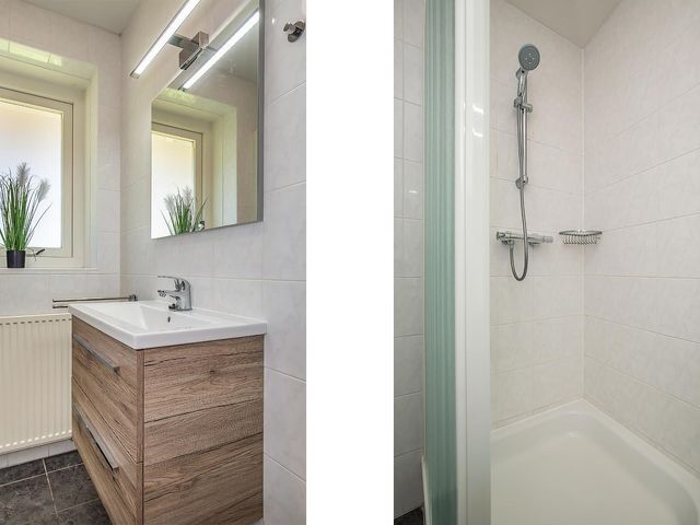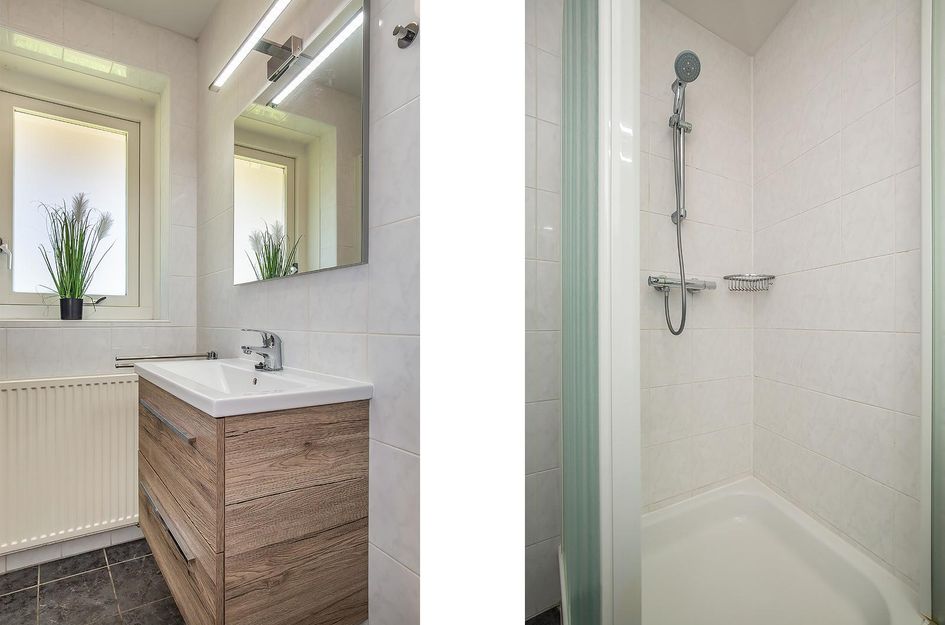Im Erdgeschoss befindet sich ein geräumiges Schlafzimmer mit Doppelbett und einem eigenen Badezimmer mit Duschkabine und Waschbecken mit Waschtischunterschrank. Daher eignet sich dieses Ferienhaus auch für Personen, denen das Treppensteigen Mühe bereitet.