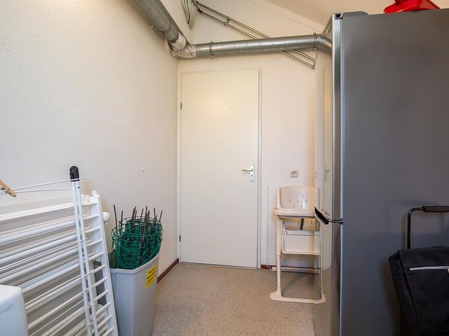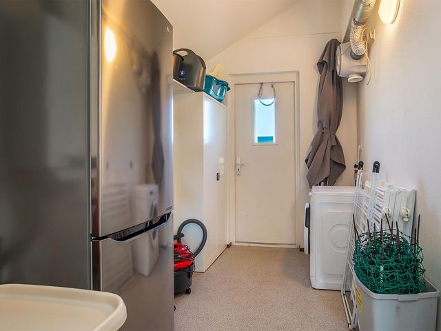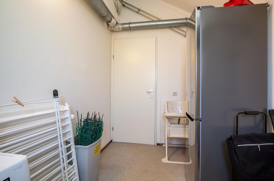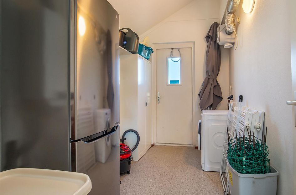 De ruime inpandige berging is te bereiken vanuit het woongedeelte en vanaf buitenzijde. Hier staat een wasmachine, een extra koel-vriescombinatie en er is nog voldoende ruimte voor bijvoorbeeld fietsen.
