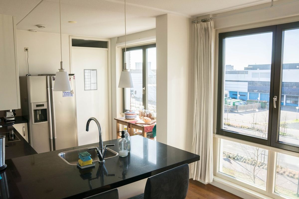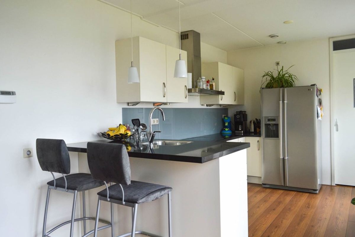 De ruime woonkamer heeft opvallend veel lichtinval dankzij de grote raampartijen. De open keuken is voorzien van inbouwapparatuur en een praktisch barretje. Vanuit de woonkamer loop je door naar een tussenhal met toegang tot de badkamer, uitgevoerd met een ligbad, aparte douche en wastafel. Aan de overzijde bevindt zich een aparte wasruimte met aansluiting voor wasmachine en droger.