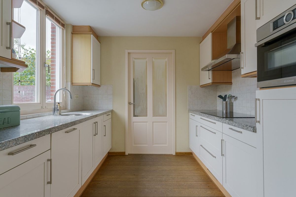 Begane grond – Entree met toilet en trapopgang. Lichte, brede woonkamer met grote raampartijen en zicht op de tuin; prettige indeling met plek voor royale zit- en eethoek. Open keuken met veel werk- en bergruimte, in open verbinding met de living.
