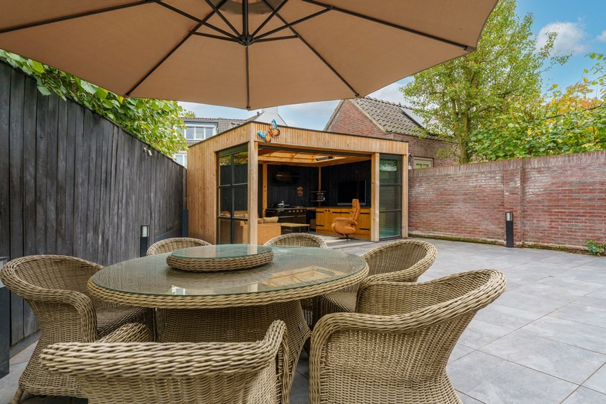 De fraai aangelegde achtertuin (ca. 194 m², oosten) biedt veel privacy en plek voor eettafel, loungeset en speelruimte. Blikvanger is de tuinkamer: een hoogwaardige, afsluitbare ruimte die het hele jaar door bruikbaar is als tweede woonkamer, werkplek of speelkamer. Daarnaast is er een externe berging van 17 m². Geen achterom. Verzorgde voortuin completeert het geheel.