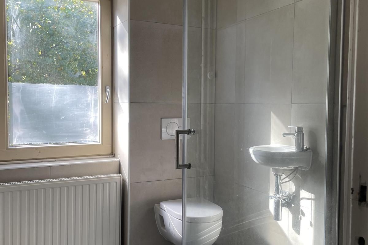Overloop met toegang tot de badkamer, twee slaapkamers (ca. 8,2 en 13,8 m²) en het dakterras (ca. 30 m²). De badkamer is ingericht met een toilet, wastafel en een inloopdouche.