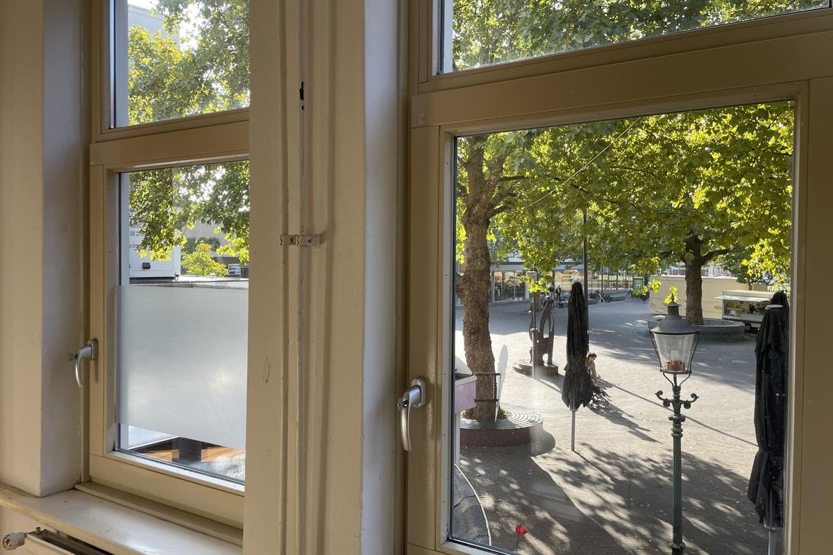 Hal met toegang tot het aparte toilet, de wasruimte (ca. 7,9 m²) en een buitenruimte (ca. 6 m²). Middels een dubbele klapdeur is de woonkamer (ca. 37,5 m²) met open keuken (ca. 7,2 m²) bereikbaar. De verhoging in de woonkamer zorgt voor een speels effect. De keuken is recent vernieuwd en ingericht met een vaatwasser, inductiekookplaat, afzuigkap, koelkast en een combi oven/magnetron. De vele ramen bieden een heerlijk uitzicht over het plein.