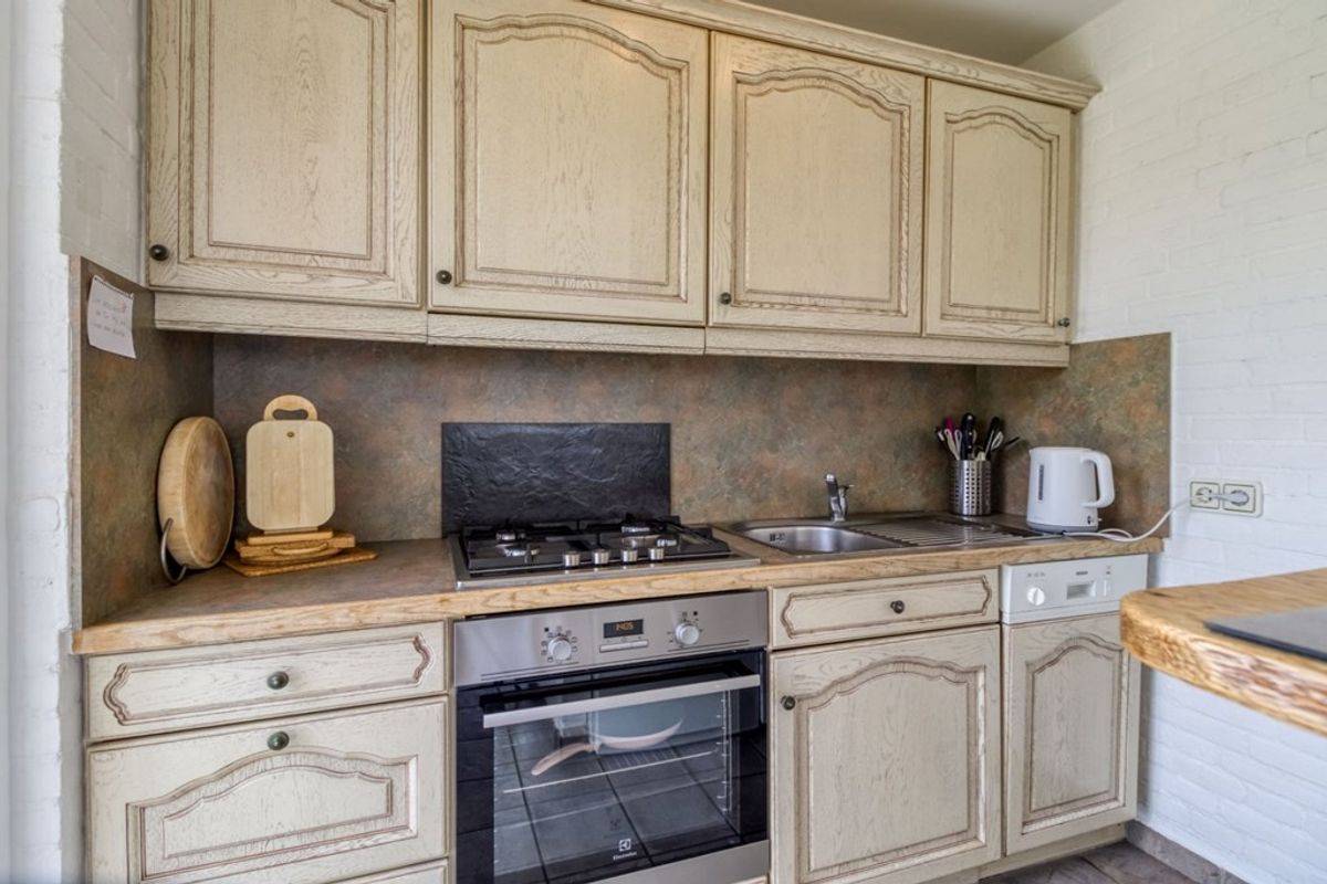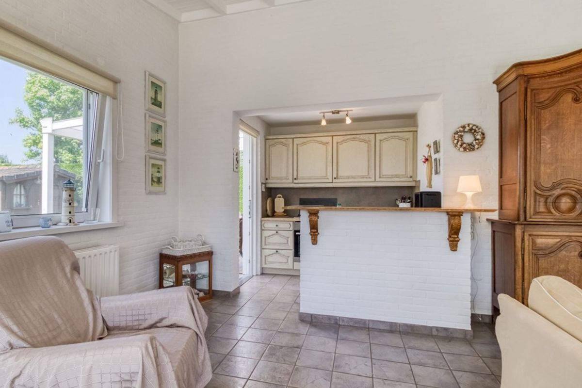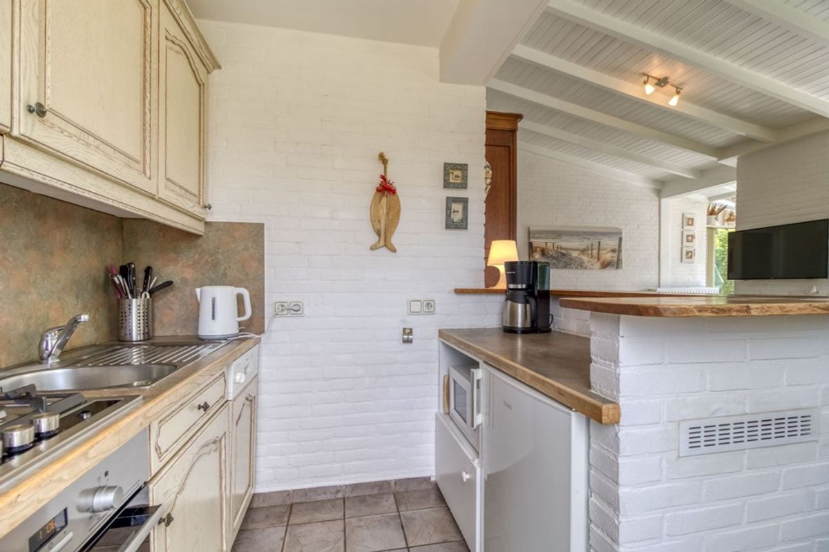 De open keuken in hoekopstelling en met barretje is voorzien van: 4-pits gaskookplaat, afzuigkap, spoelbak, oven, vaatwasmachine, losse koelkast en magnetron. In de keuken is er een tuindeur naar de tuin aan de zijkant van de woning. Hier bevindt zich een tweede terras welke overdekt en windbeschut is waardoor het al vroeg in het jaar mogelijk is om hier heerlijk buiten te zitten.