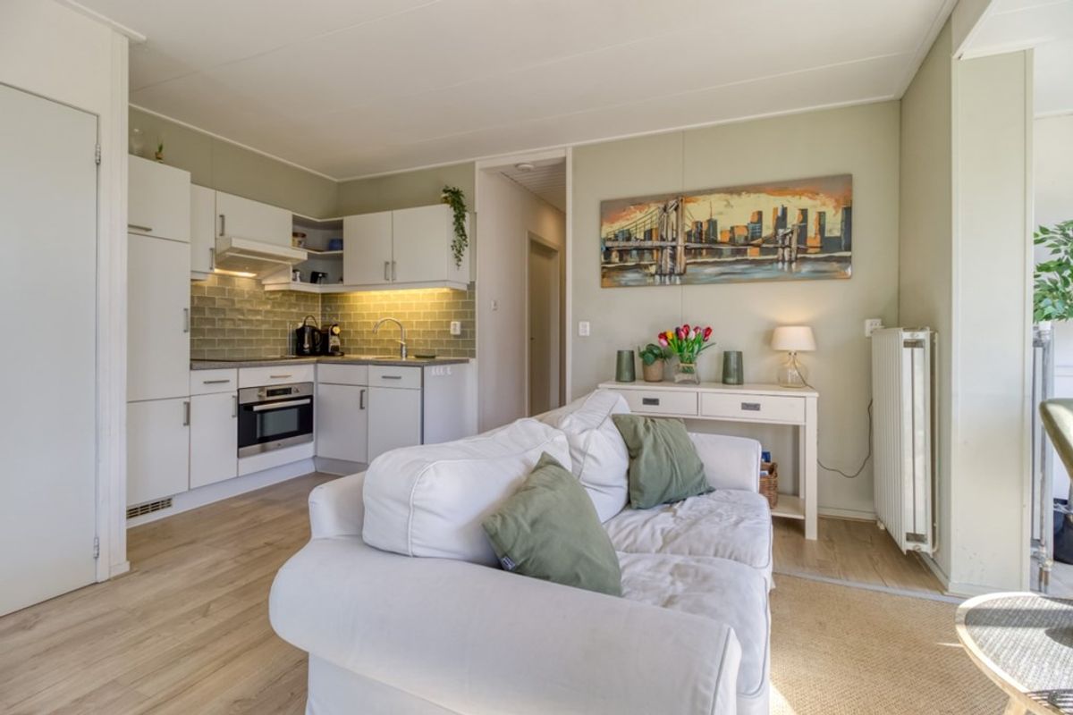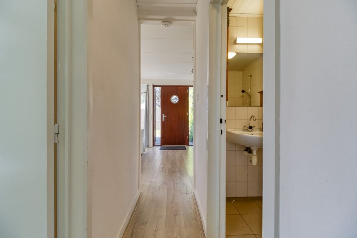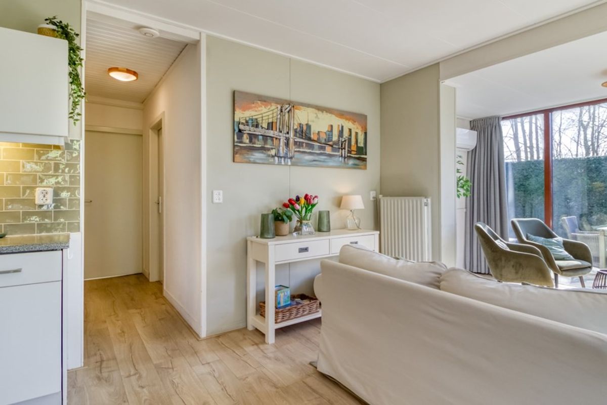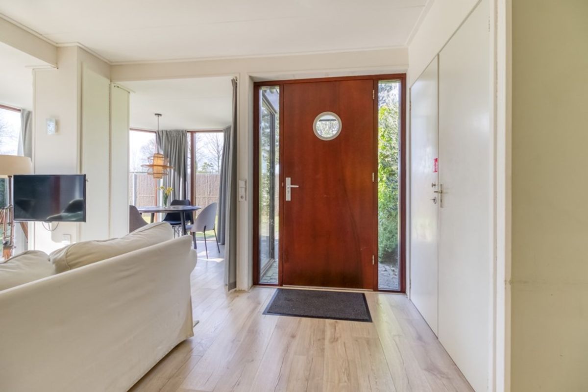 Via de entree komt u direct binnen in de woonkamer. De woonkamer heeft grote raampartijen waardoor er erg veel licht binnen komt. De zon heeft dan ook alle ruimte om heerlijk naar binnen te schijnen. Via openslaande tuindeuren komt u in de tuin.