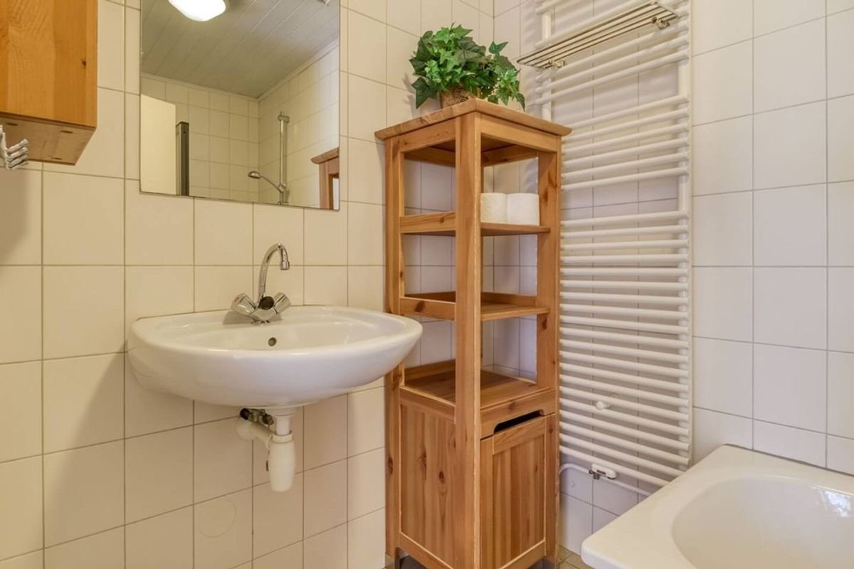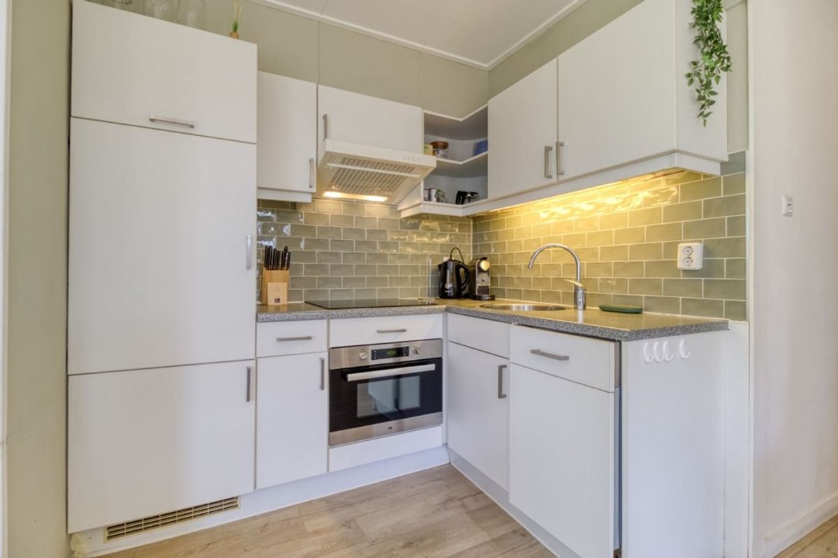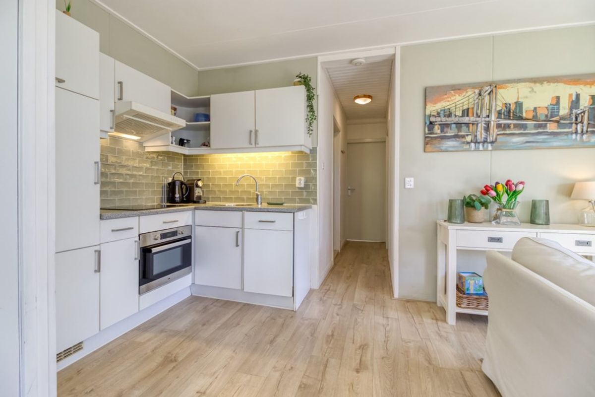Er is een open keuken in hoekopstelling die is voorzien van: 4-pits elektrische kookplaat, afzuigkap, spoelbak, oven, vaatwasmachine en koelkast met vriesvak. In de berging/bergkast bevindt zich een wasmachine en is plaats voor huishoudelijke spullen. Via de hal zijn de twee slaapkamers te bereiken. Origineel waren er 3 slaapkamers maar van de twee kleinste kamers is één grotere gemaakt. De badkamer is voorzien van ligbad, wastafel en toilet.